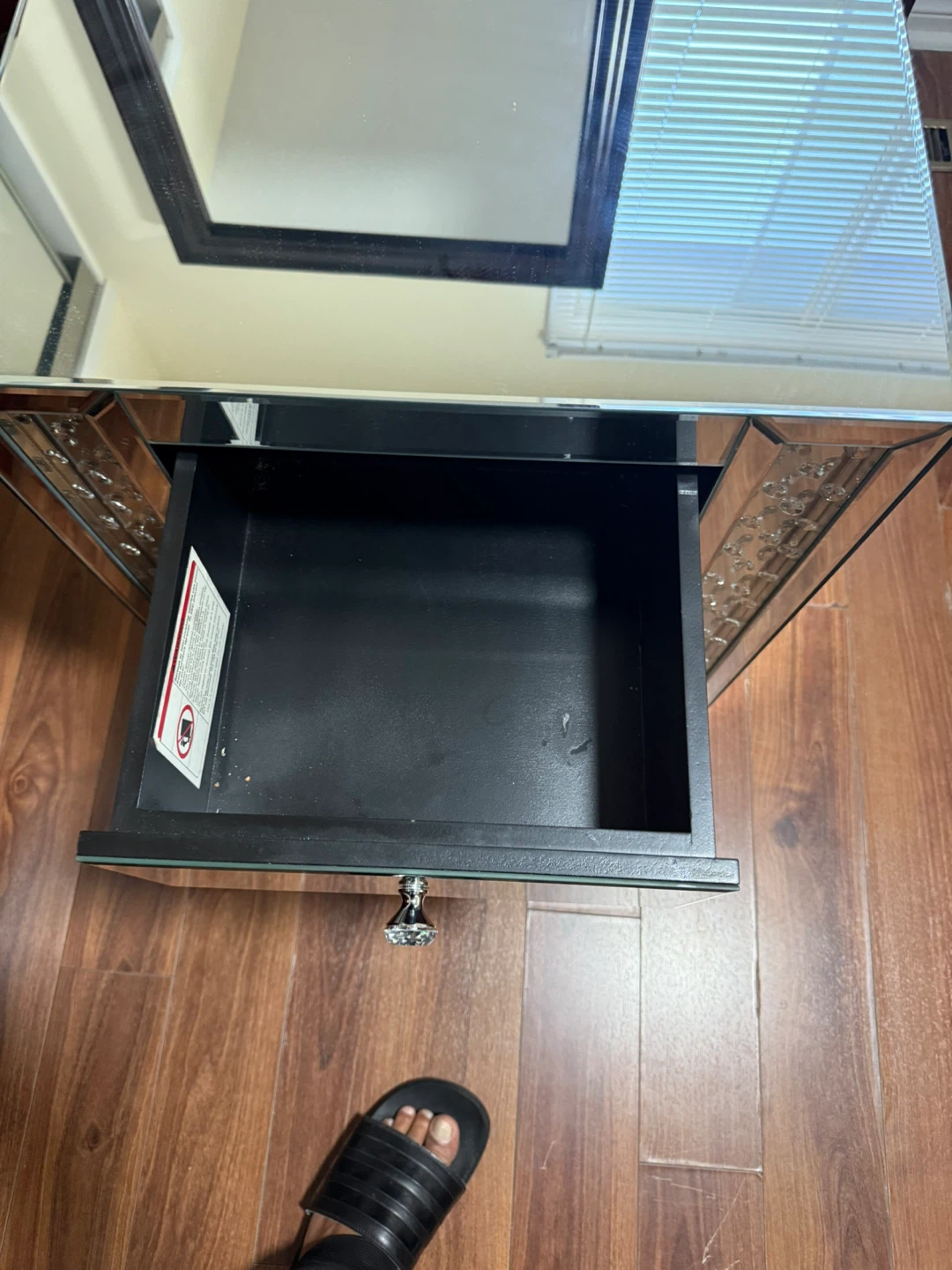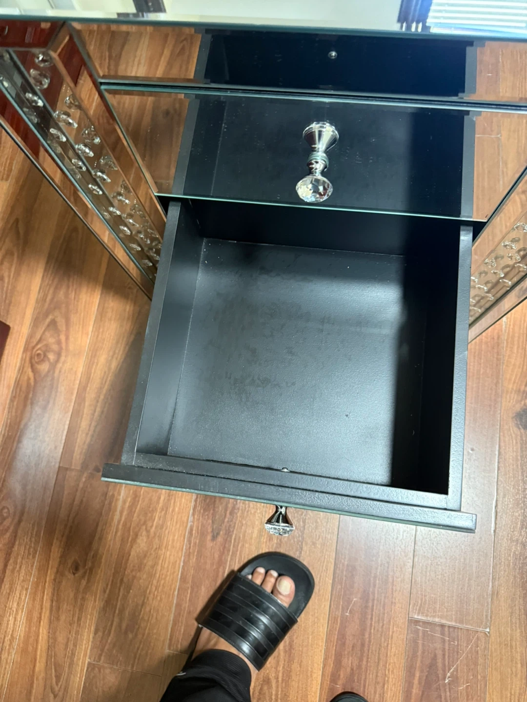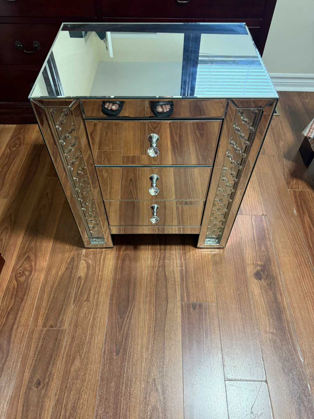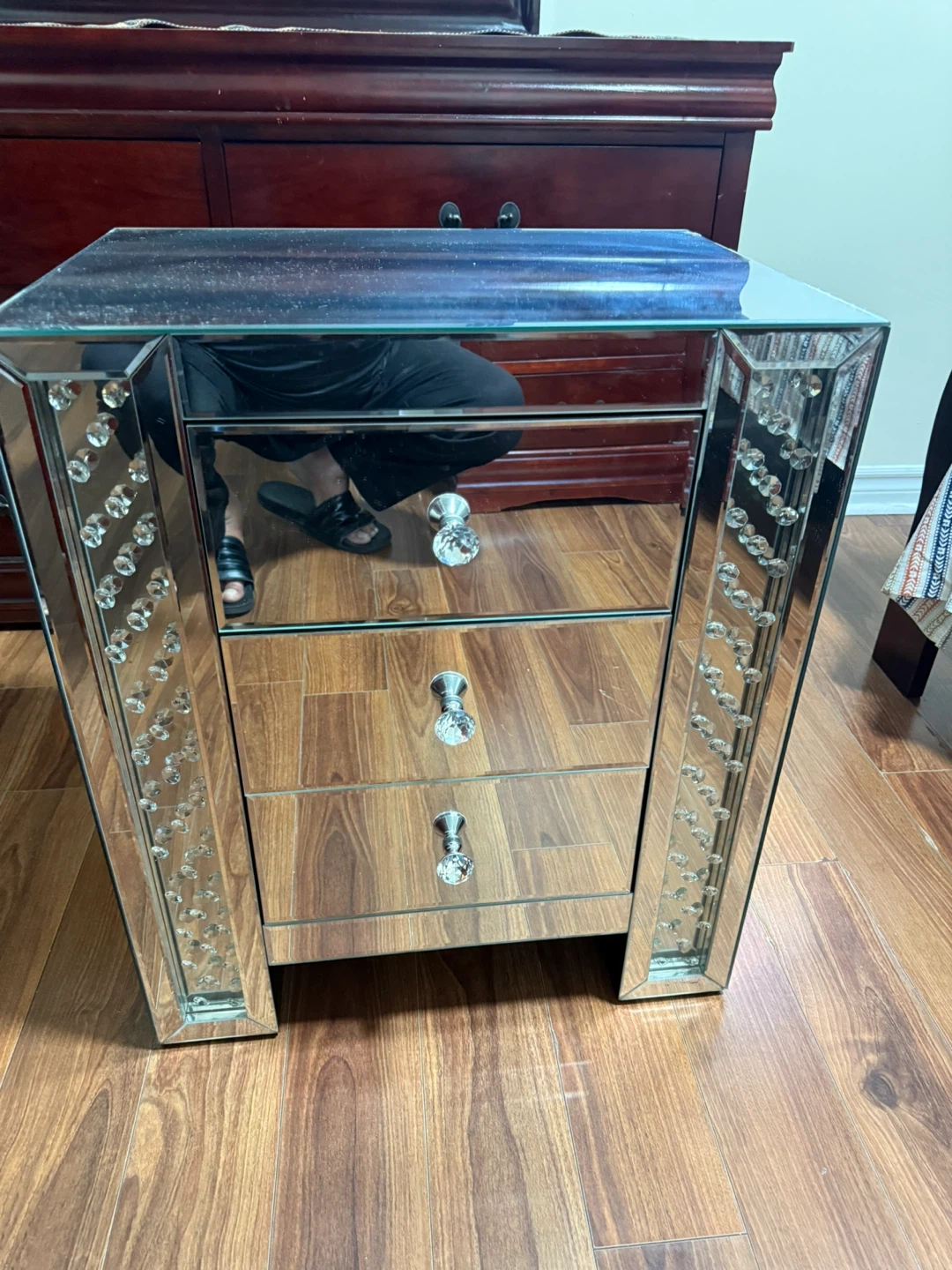 Selling a mirrored nightstand with three drawers. It features crystal-style knobs and decorative accents on the sides. It's a stylish piece to add some sparkle to your bedroom!