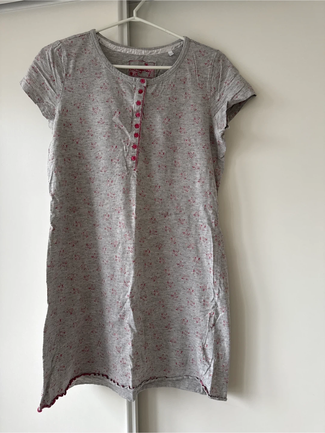 Cute grey nightdress with a pink floral pattern and pink button detailing. It's in great condition and ready for a new owner!