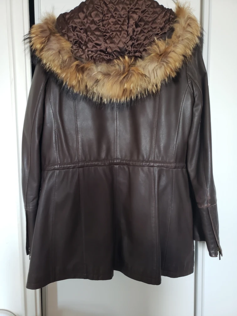 Selling a Danier leather coat that's in great shape! It's a stylish brown colour and features a cozy fur hood. The coat has a quilted lining, adding extra warmth for those chilly days.