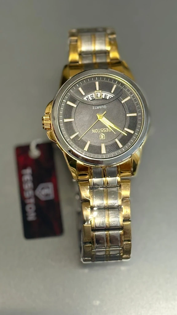 Selling a Tesston Quartz watch with a two-tone gold and silver band. It features a black face and date display. The watch is in great condition and comes with the original tag still attached!