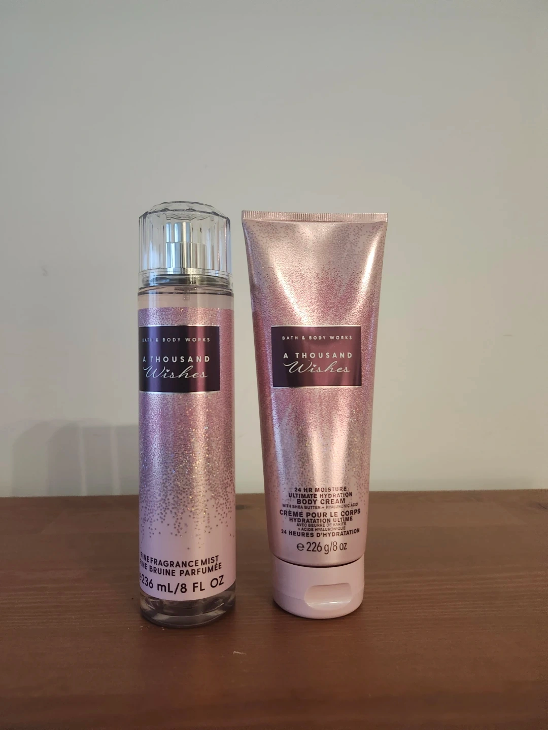 Giving a Bath & Body Works set in the A Thousand Wishes scent! It includes a fine fragrance mist (236 mL/8 fl oz) and an ultimate hydration body cream (226 g/8 oz). Both are perfect for adding a touch of sparkle and fragrance to your day.