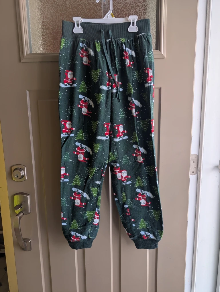 Brand new without tags, Mens size medium, Joe Boxer brand, Christmas pajama set. Front of shirt has Santa snowboarding with the word "SHRED". Pants have Santa snowboarding with trees. Cotton tshirt, cotton flannel pants.