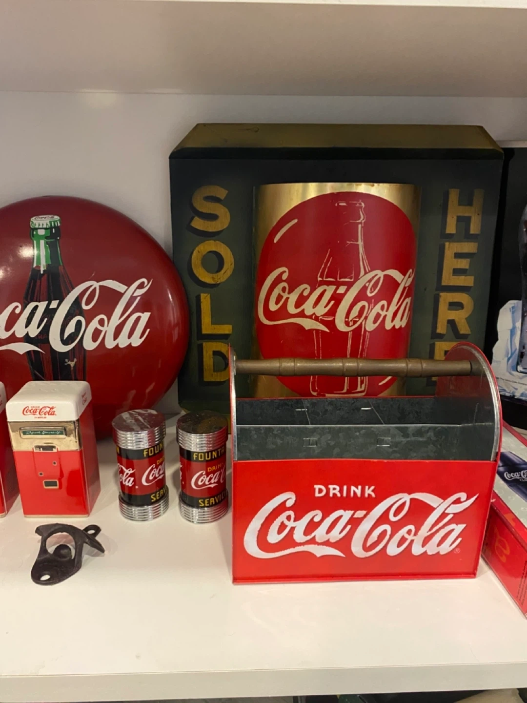 A variety of Coca-Cola collectibles, including tins, signs,bank,salt and pepper shakers, starr bottle opener, shower curtain(not pictured) . Prefer to sell all together