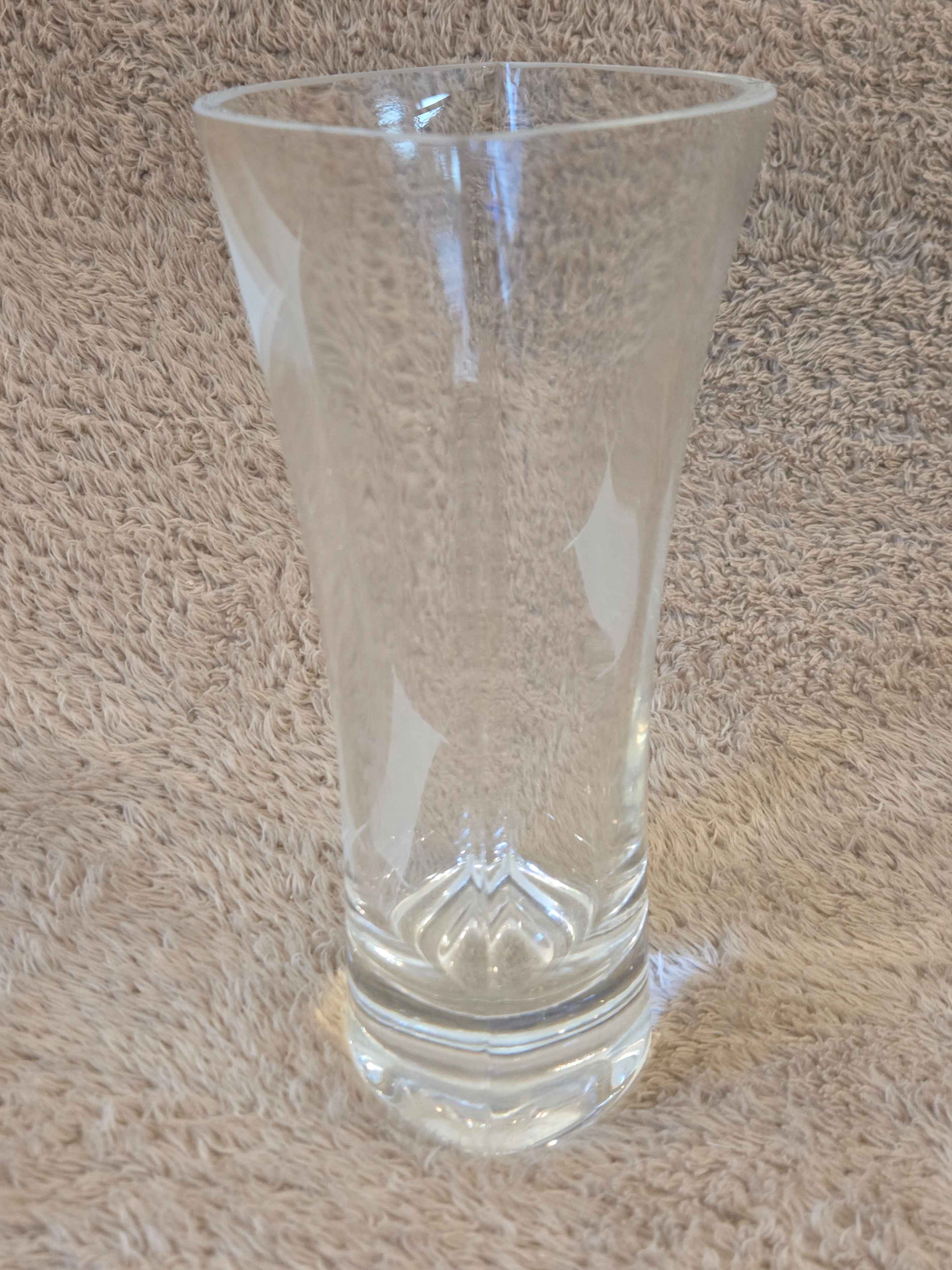 Simple and elegant clear glass vase with a frosted diamond motif. Heavy square base, flared mouth with a diamond-shaped rim – great for fresh flowers or minimalist décor.