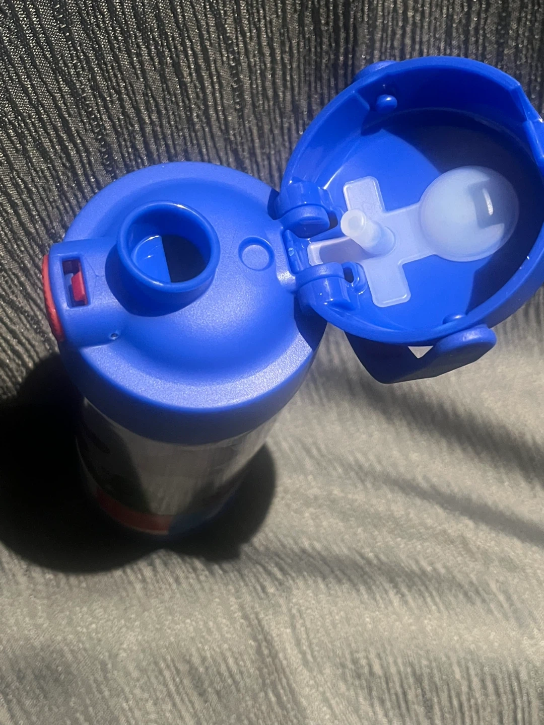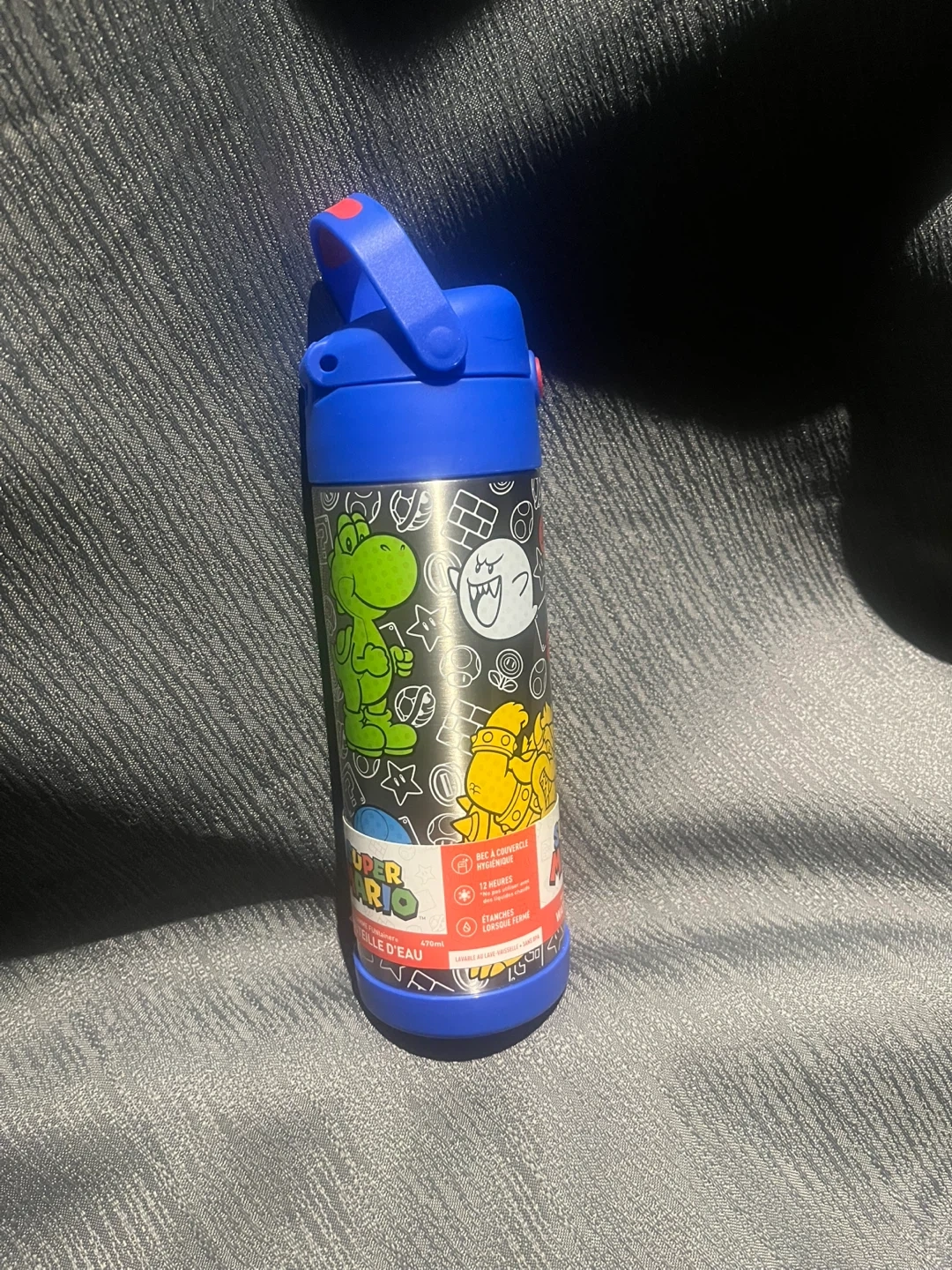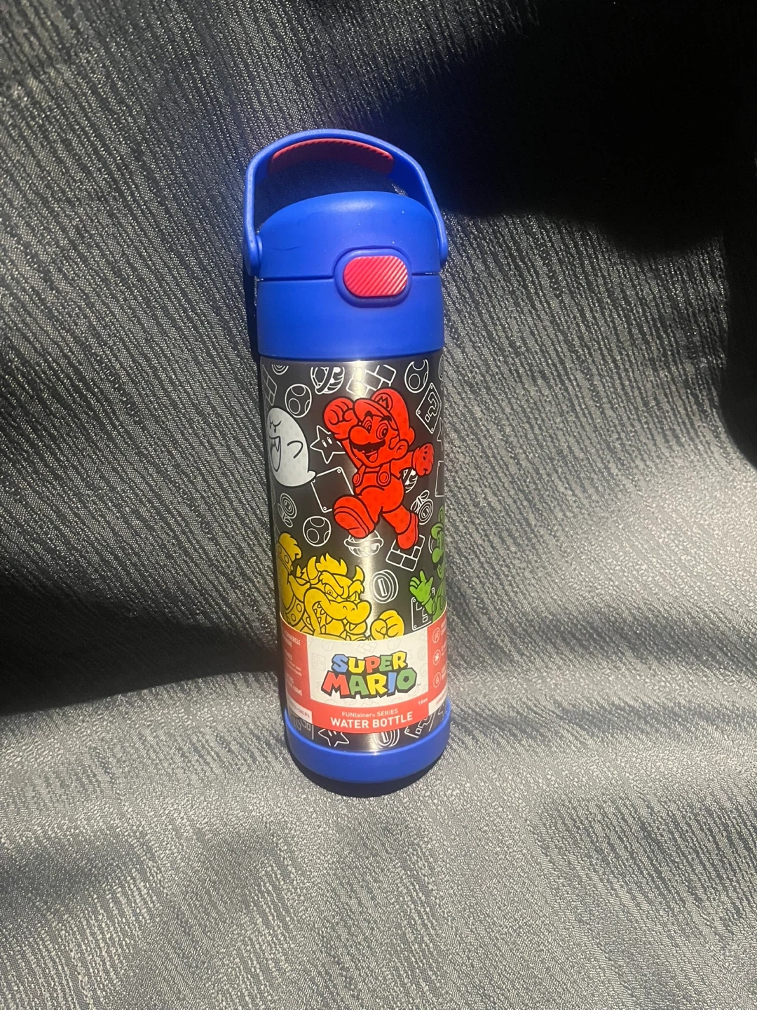 I'm selling a Thermos Funtainer kids water bottle! It's blue and features Super Mario characters. It keeps drinks cold for 12 hours and is leak-proof. It holds 355ml.