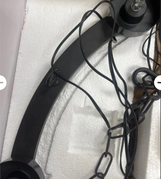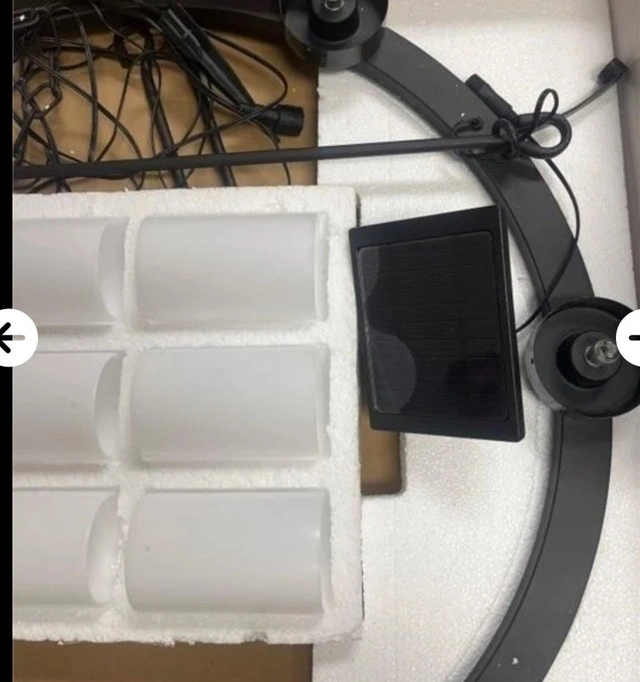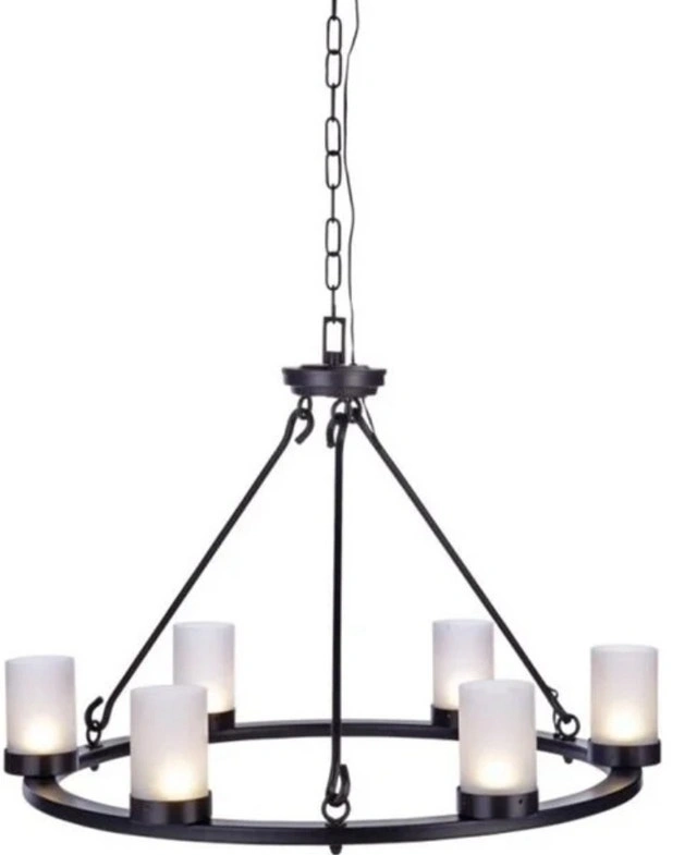 Illuminate your outdoor space with this stylish solar powered chandelier, designed with a circular frame and six frosted glass shades. This fixture is new, still in its original packaging. Add a touch of elegance to your outdoor area with this eye-catching piece. Key features: * Circular design with a modern touch * Six frosted glass shades for a soft, ambient light * Sturdy metal construction * Easy to install If the ad's up, it's still available!