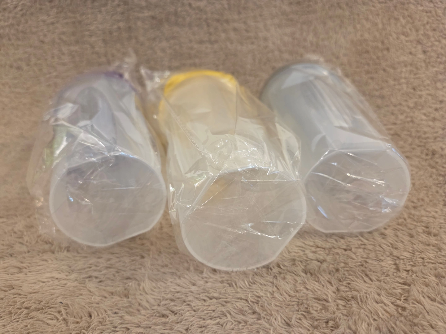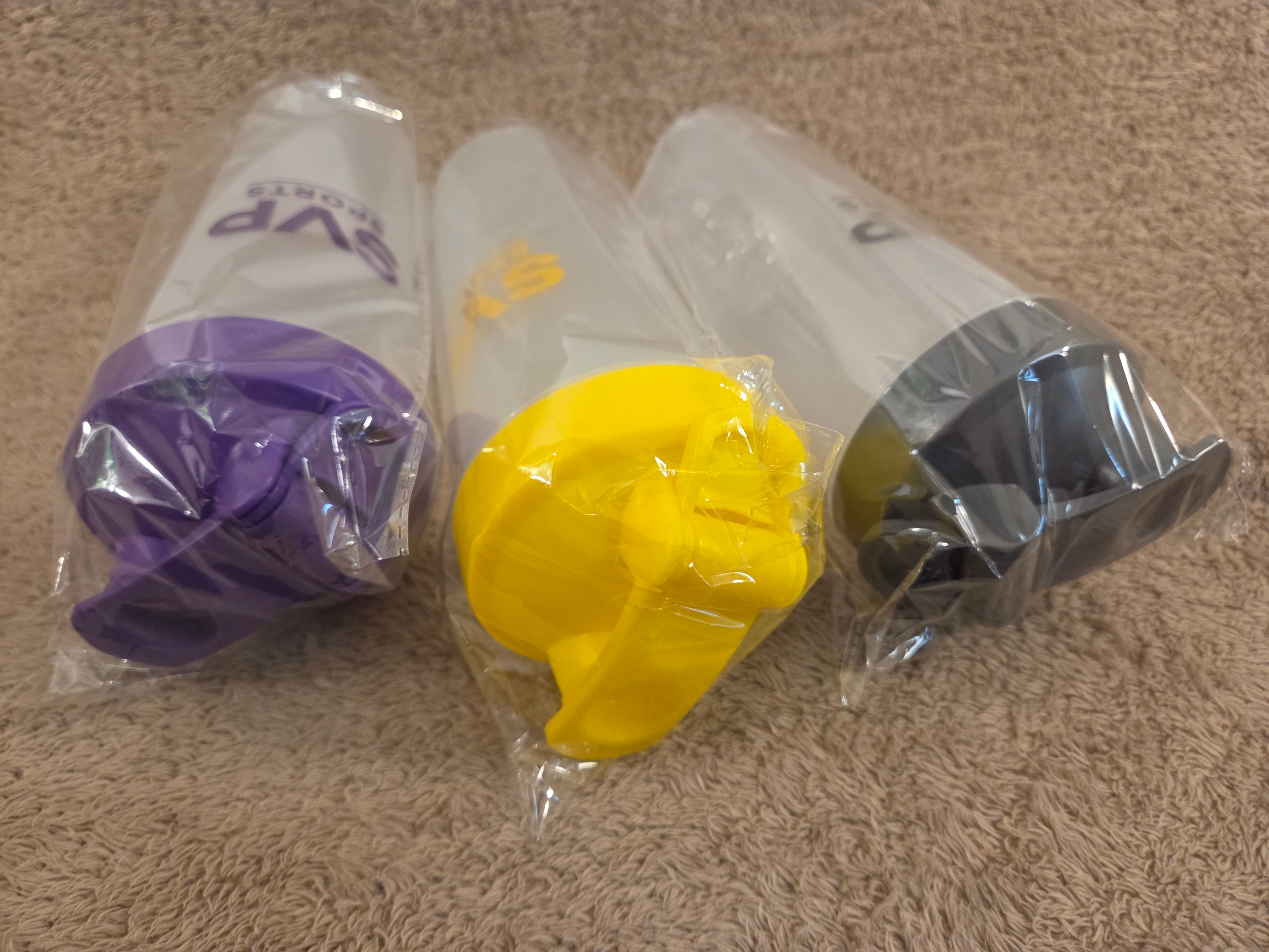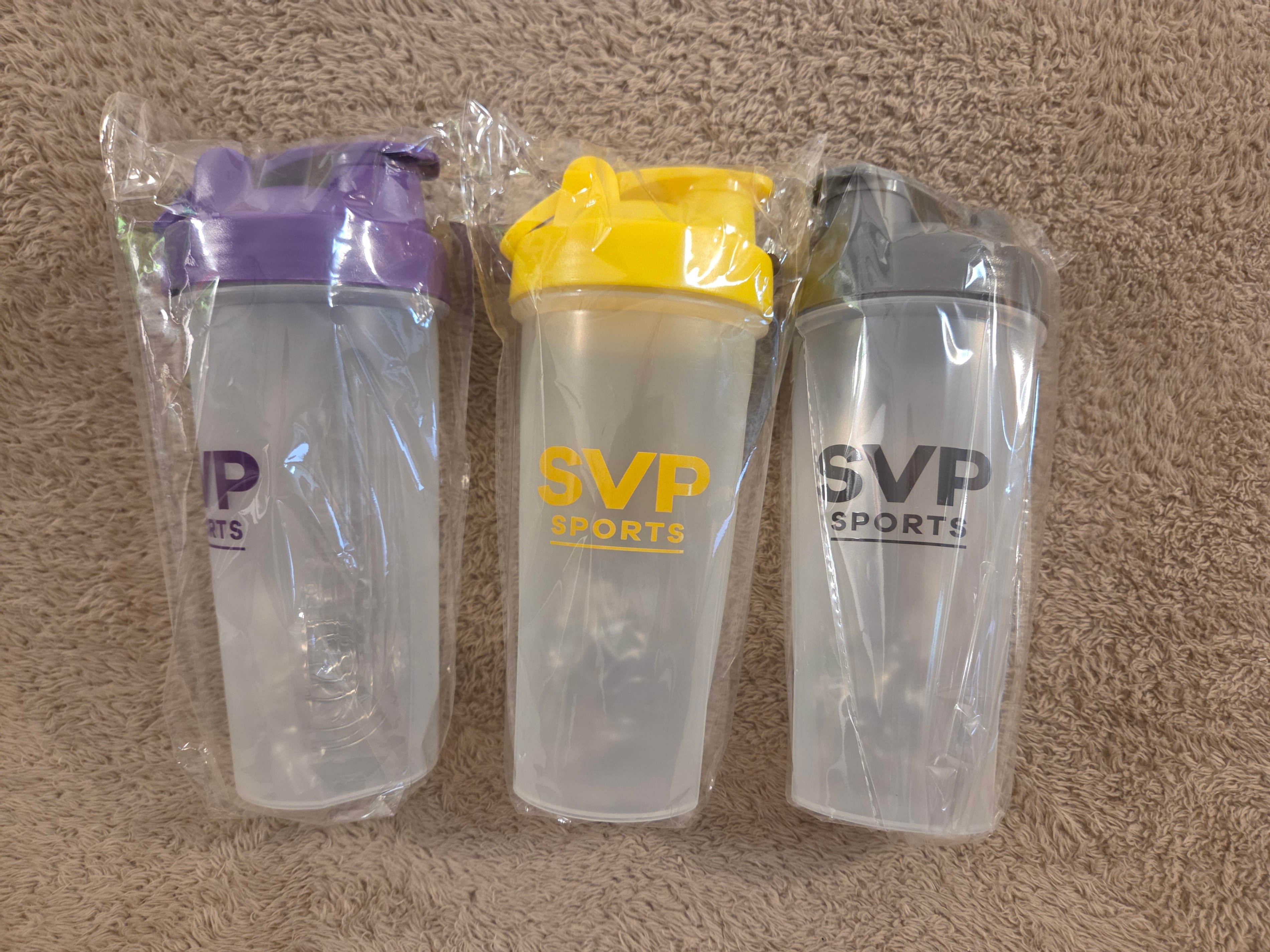 New, sealed SVP Sports protein shaker bottles – set of three in matching translucent bodies with colored lids (Purple, Yellow, Grey). Each bottle includes a stainless-steel mixer ball for smooth shakes and a flip-top spout.