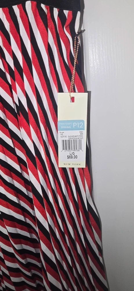 Brand New Tag Still On...This is a DEX pleated skirt in a size large. It features a stylish red, black, and white striped pattern. The tag shows it was originally $69.00