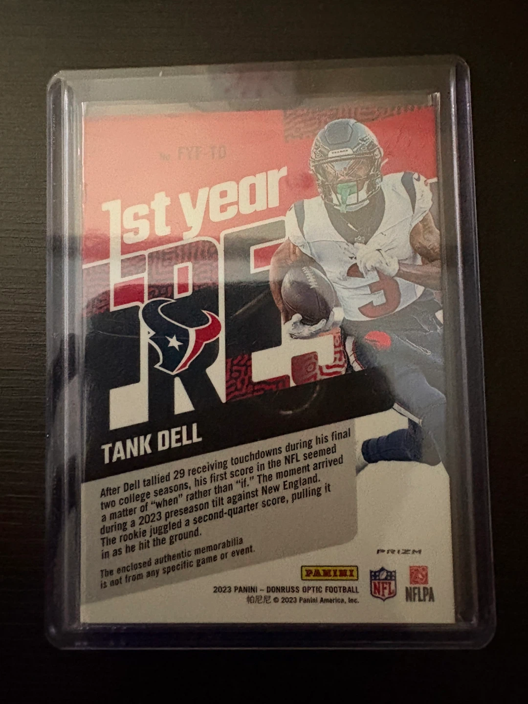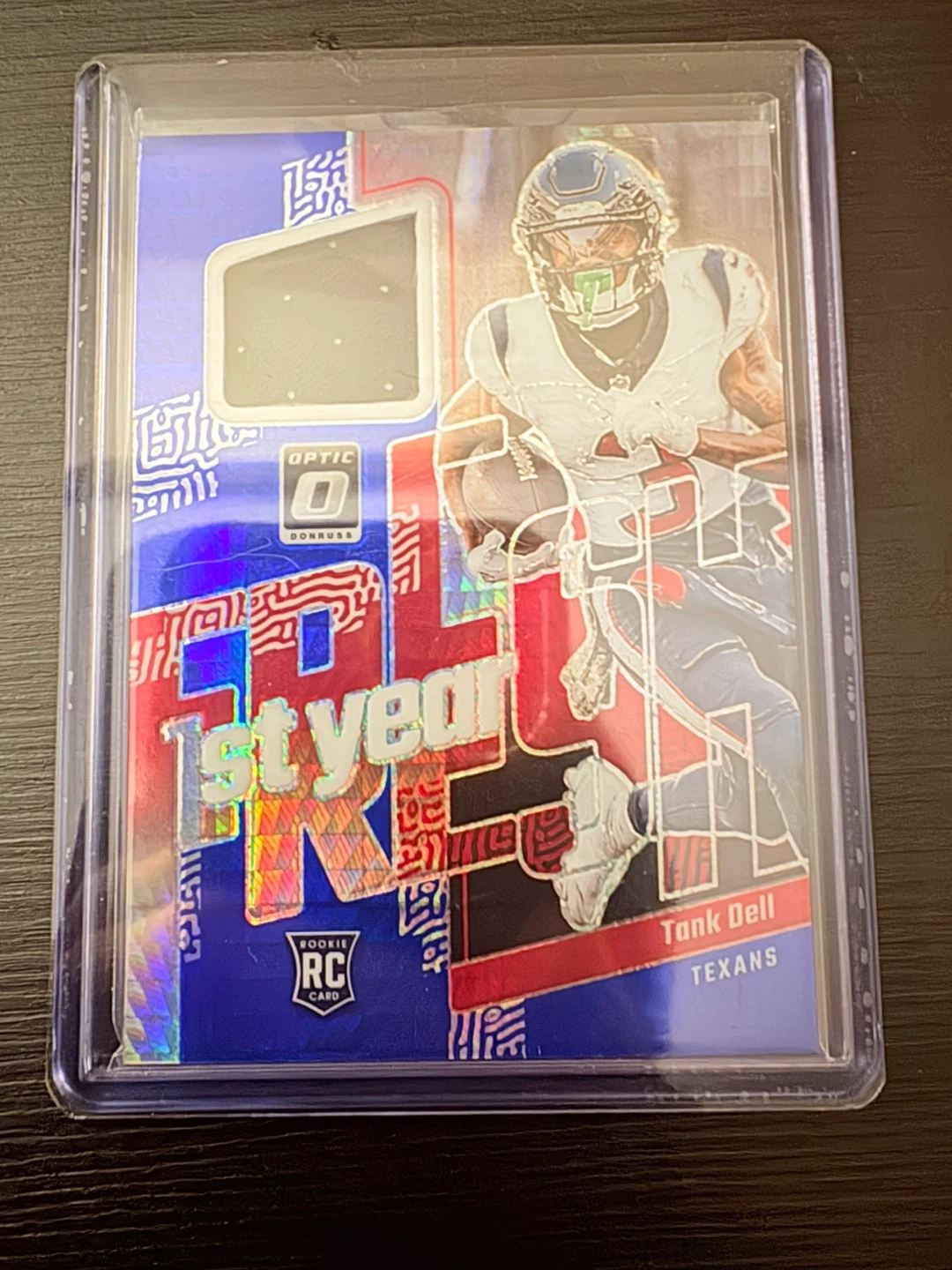 Selling a Tank Dell Texans rookie card from the Donruss Optic collection. It's in great condition and has jersey worn on it. Perfect for any football card collector!