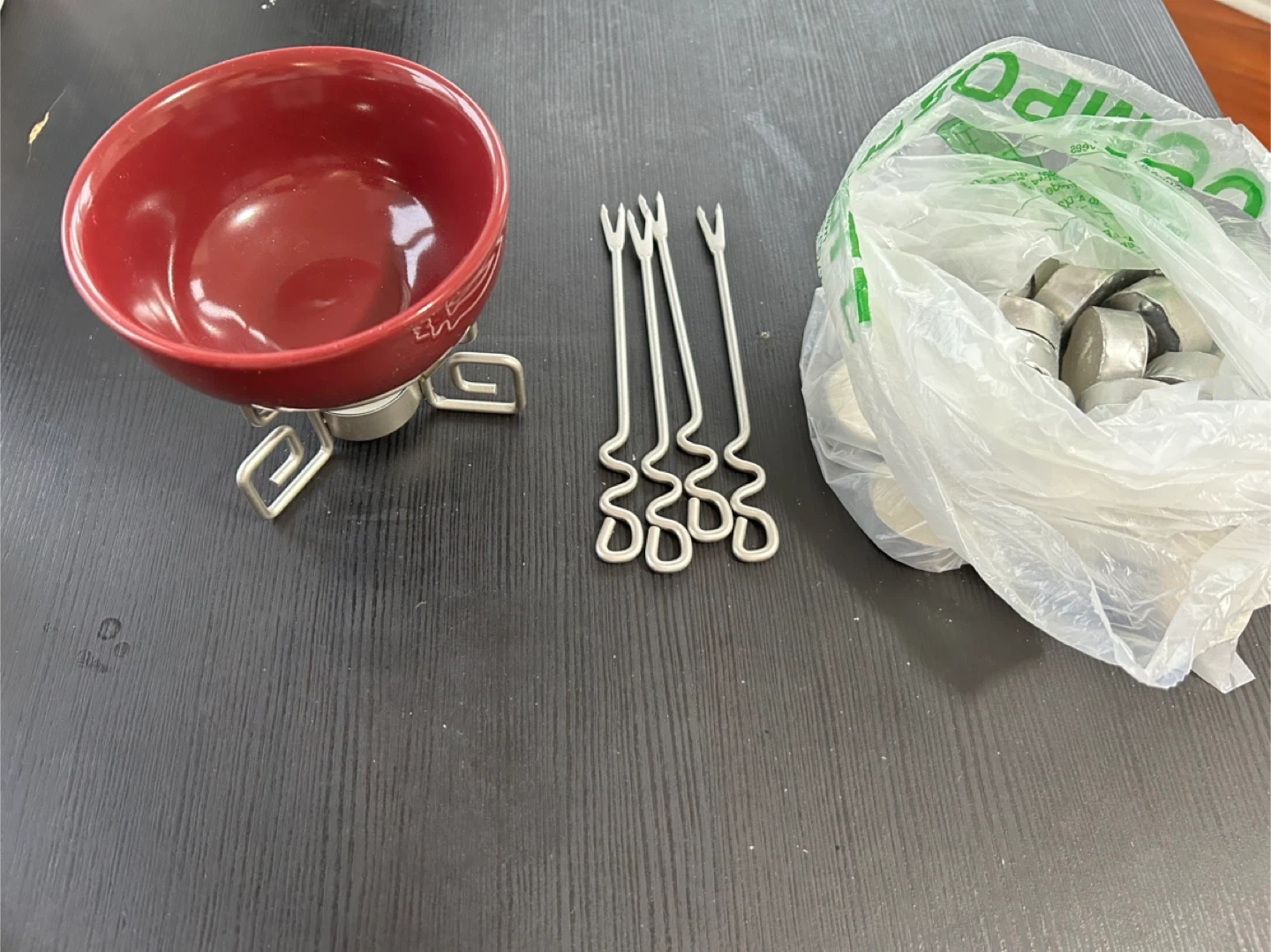 Fondue set includes a red ceramic bowl with a metal stand, four fondue forks, and a bag of fuel canisters