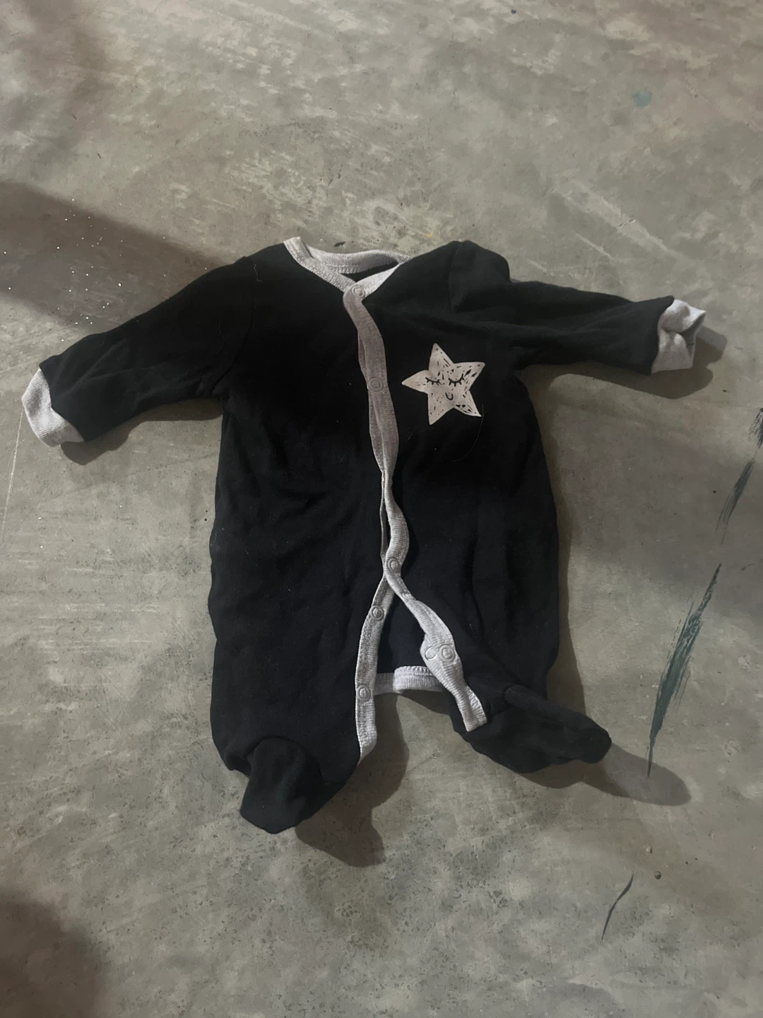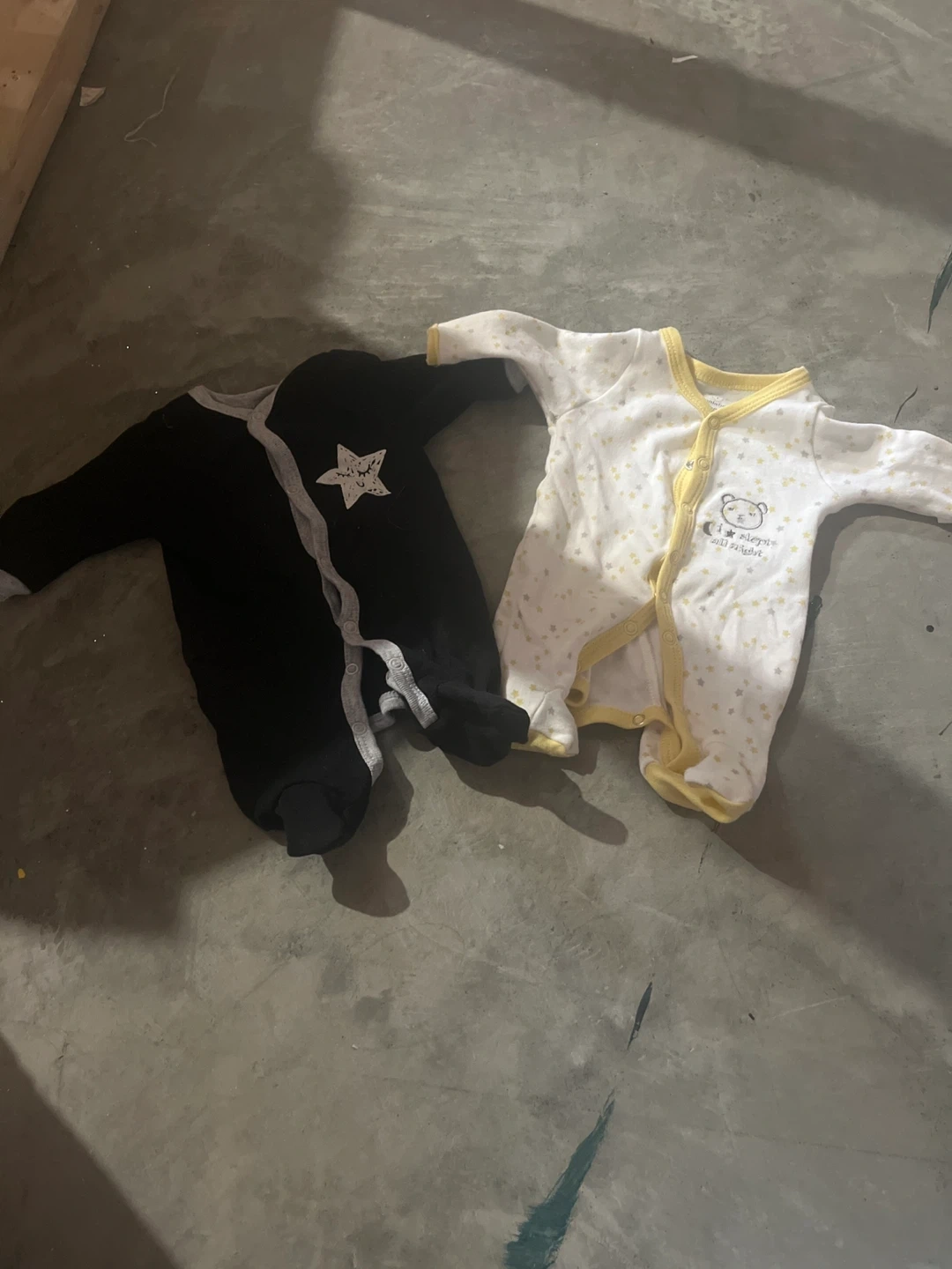 Two cute baby onesies for sale! One is black with a star design, and the other is white with a bear and star pattern. Both are in great condition and perfect for a newborn.