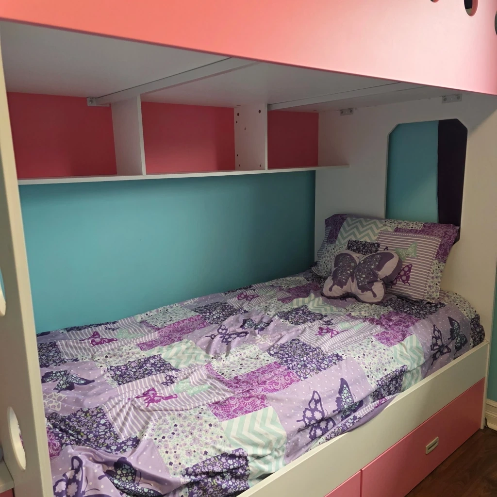 JYSK VIGGO pink bunkbed with five drawers and a shelf. Bought for $1200 a few years ago - kids have now outgrown it.