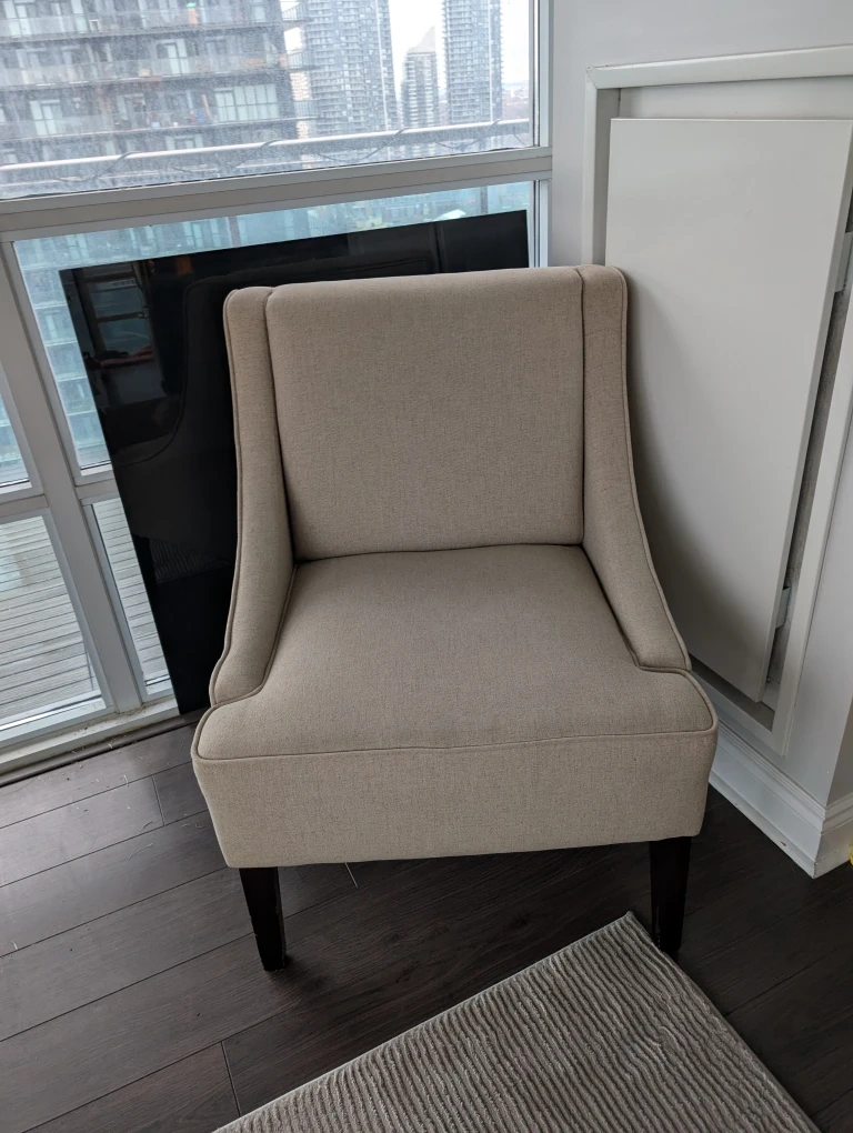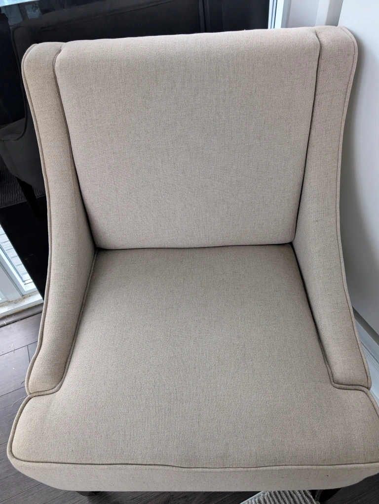 Selling a beige accent chair in perfect condition. It's a stylish and comfortable addition to any room. The neutral colour makes it easy to match with existing decor.
