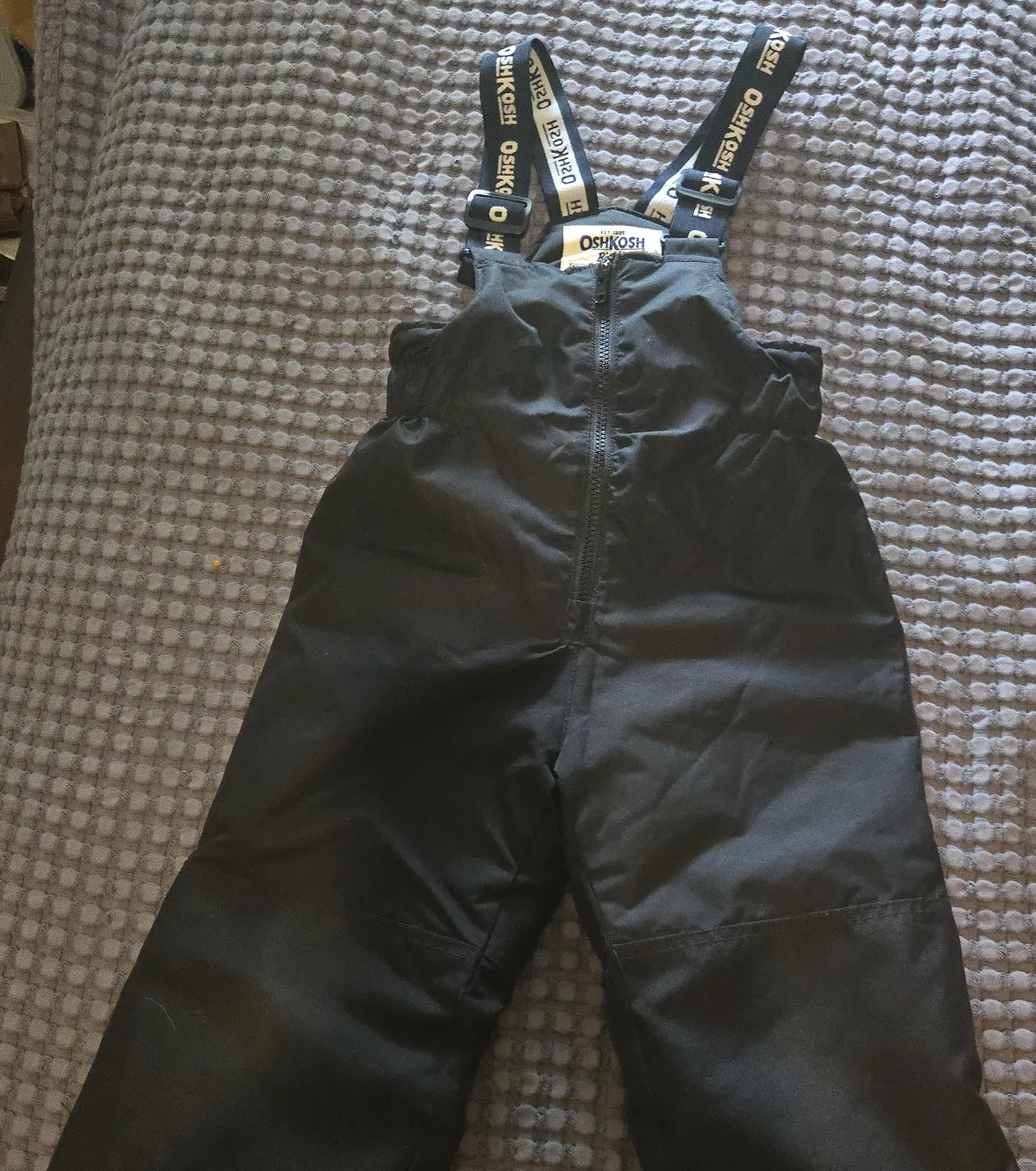 Here are some OshKosh snow pants for kids! They're black and have OshKosh straps. Perfect for keeping your little one warm and dry during winter activities