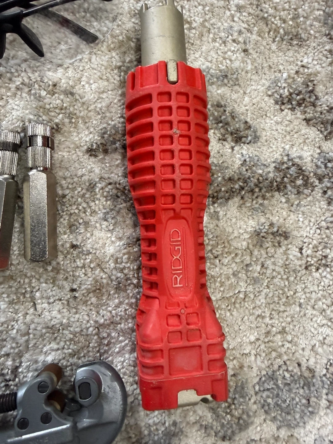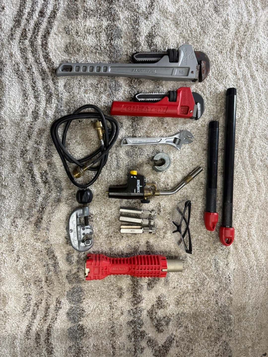 Selling a collection of plumbing tools including a Milwaukee Cheater pipe wrench, a Husky adjustable wrench, a BernzOmatic TS8000 torch, and a Ridgid pipe wrench. There's also a pipe cutter that handles sizes from 3/16 to 1 1/8 O.D. Also got a few Dewalt Power Drills sell g them separately or we can work a deal for the entire bag everything.