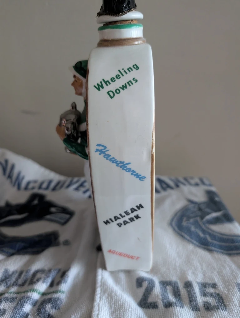 Swank Vintage 50's horse racing whiskey decanter featuring various racetracks like Garden State Park, Bay Meadows, Santa Anita, Arlington Park, Wheeling Downs, Hawthorne, Hialeah Park, Aqueduct, Pimlico, Churchill Downs, Sportsman's Park, Thistledown, Tanforan, and Belmont. Highly collectible and just saw the exact same one on eBay for $175. I'm asking $80.