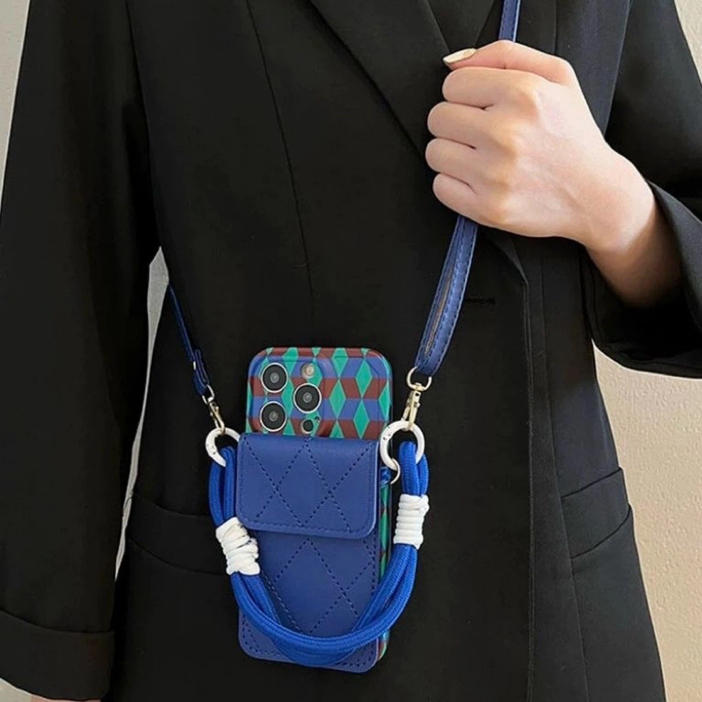 Stylish and practical case bag for iPhone 15 Pro Max, featuring two interchangeable straps: