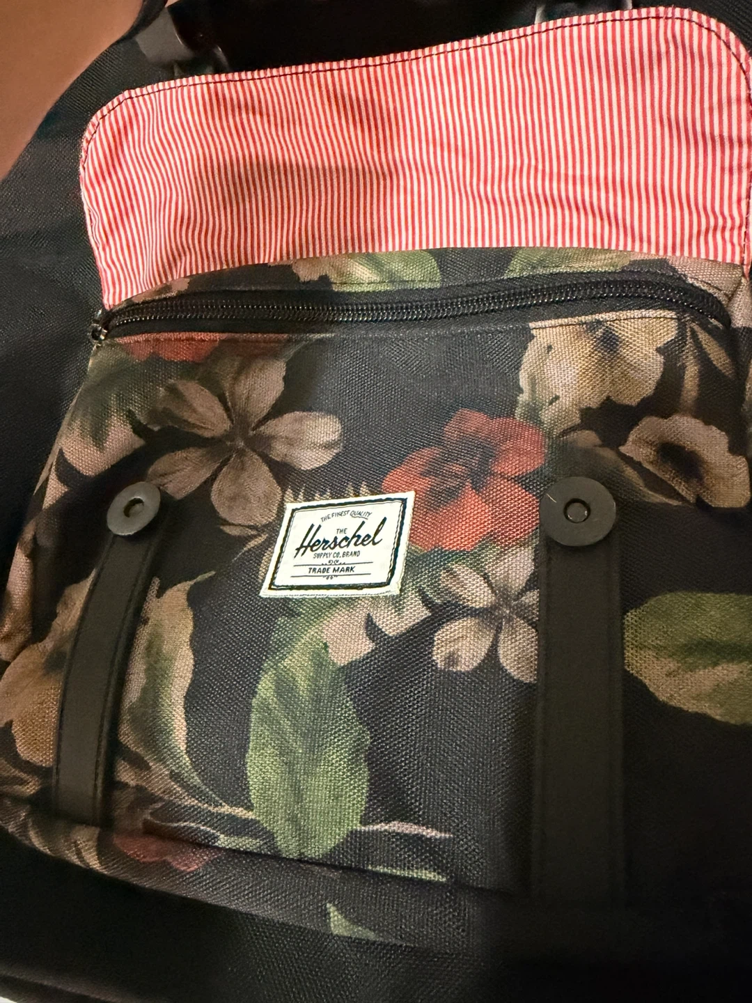 Selling a Herschel backpack with a lovely floral pattern! It's in great shape and ready for a new adventure. The interior has a red and white striped lining. Perfect for school, work, or travel! Slight blue stain on the inside of front pocket but other than that it’s in excellent condition.