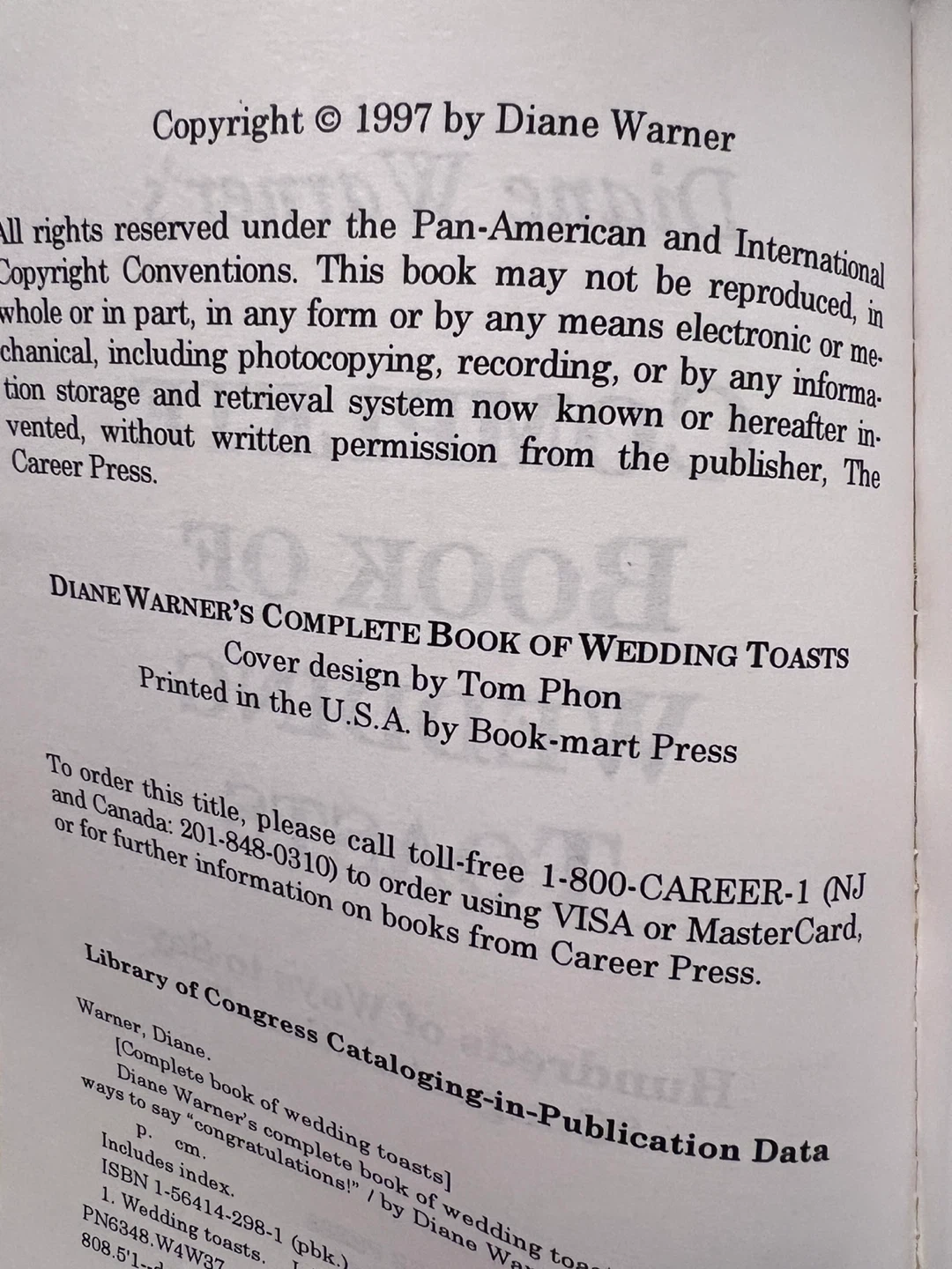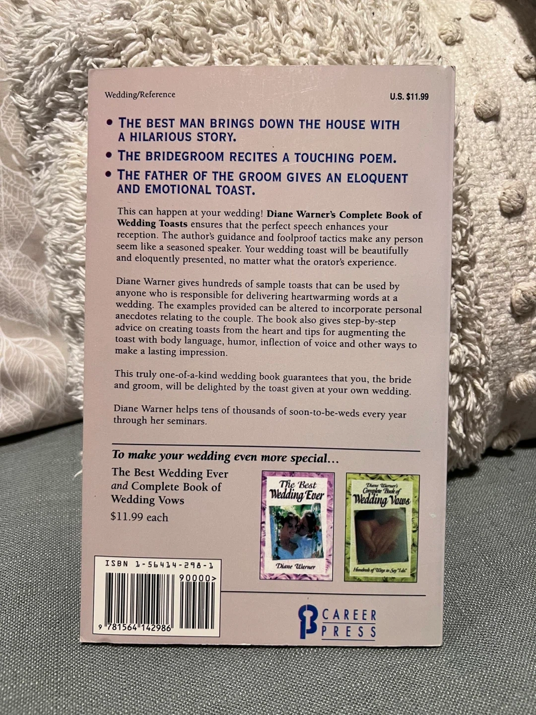 “Diane Warner's Complete Book of Wedding Toasts"! It's filled with hundreds of ways to say "Congratulations!" and make your wedding even more special. This book gives examples that can be used by anyone who is responsible for delivering heartwarming words at a wedding.