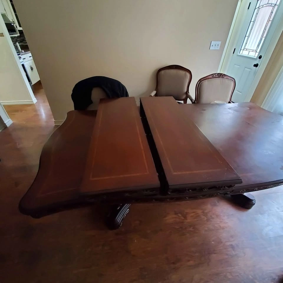 ✅ Large carved solid wood table (approx. 9 ft when fully extended – includes 2 leaves)