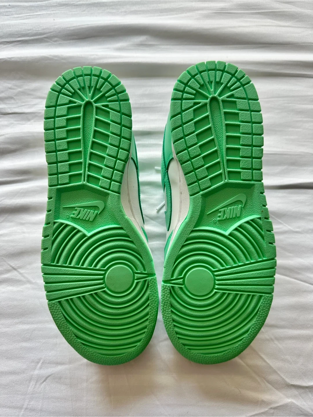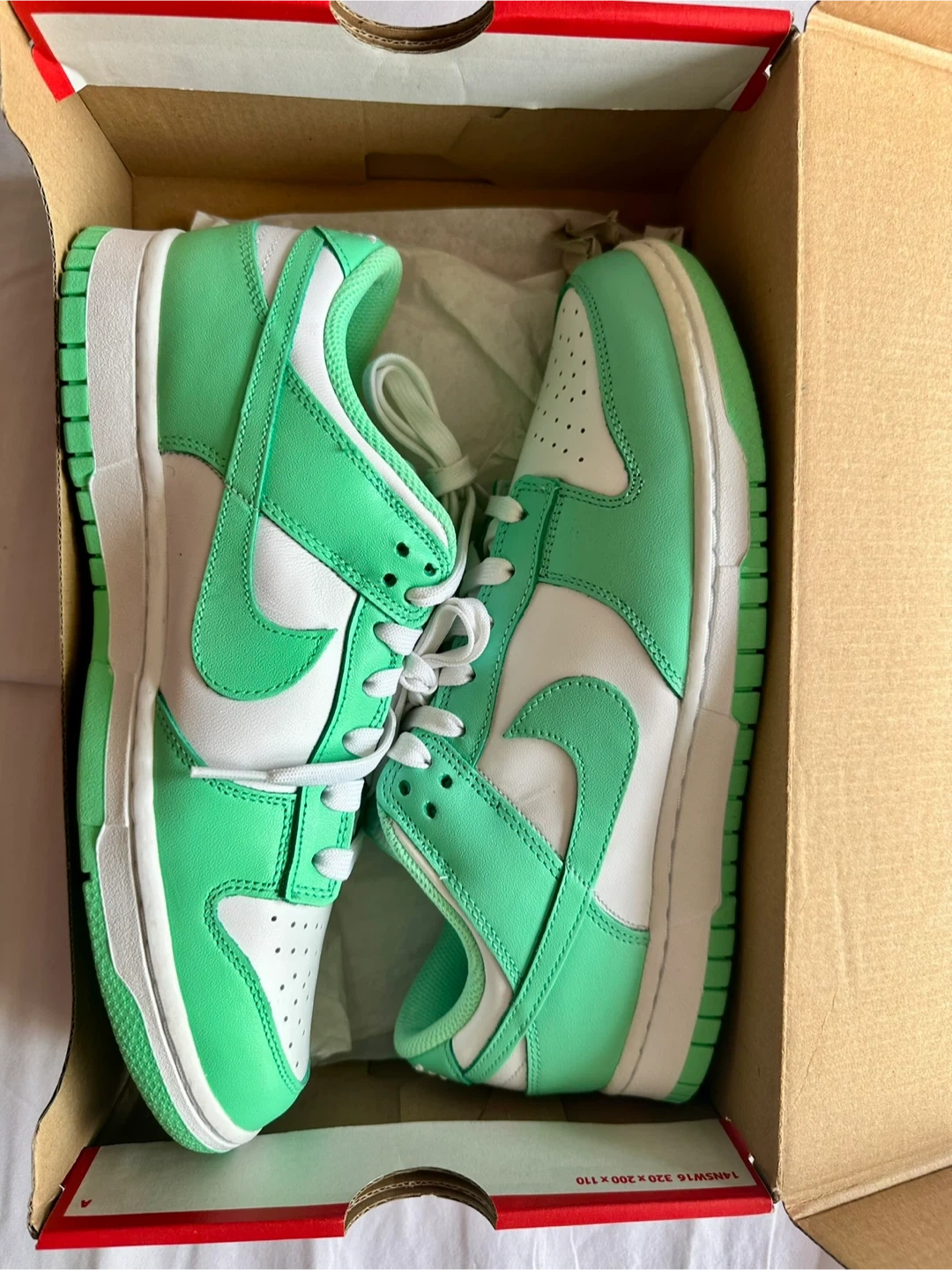 Selling a pair of Nike Dunk Low sneakers in white and green glow. These are women's size 10 US. The box is included. The original retail price was $100