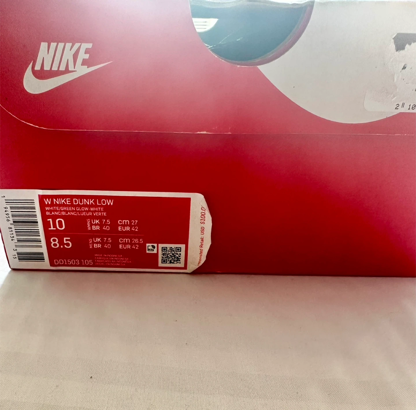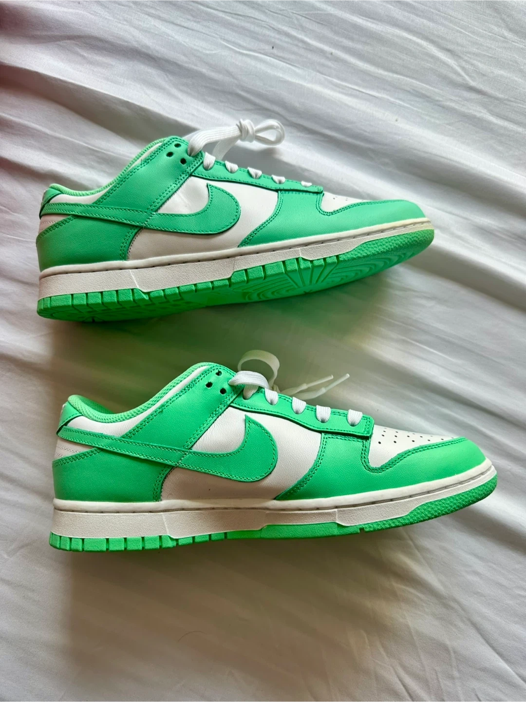 Selling a pair of Nike Dunk Low sneakers in white and green glow. These are women's size 10 US. The box is included. The original retail price was $100