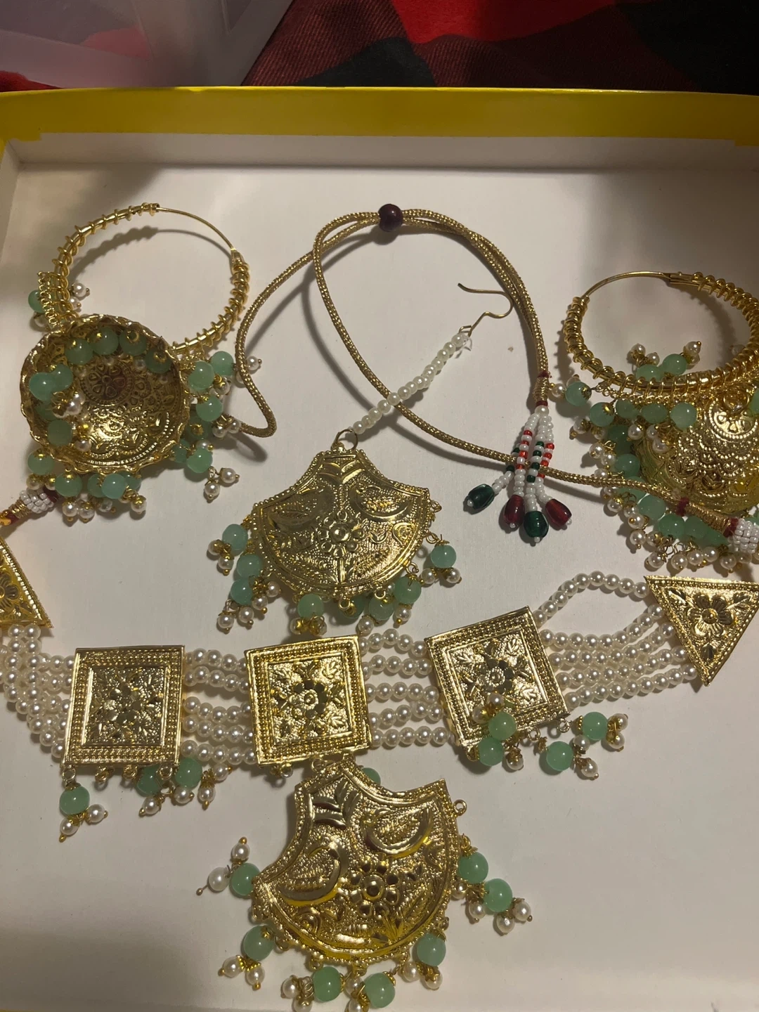 Beautiful gold-toned jewellery set with pearl and light green bead accents. Includes earrings, necklace, and headpiece. Perfect for weddings or special occasions!