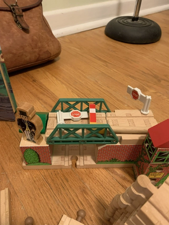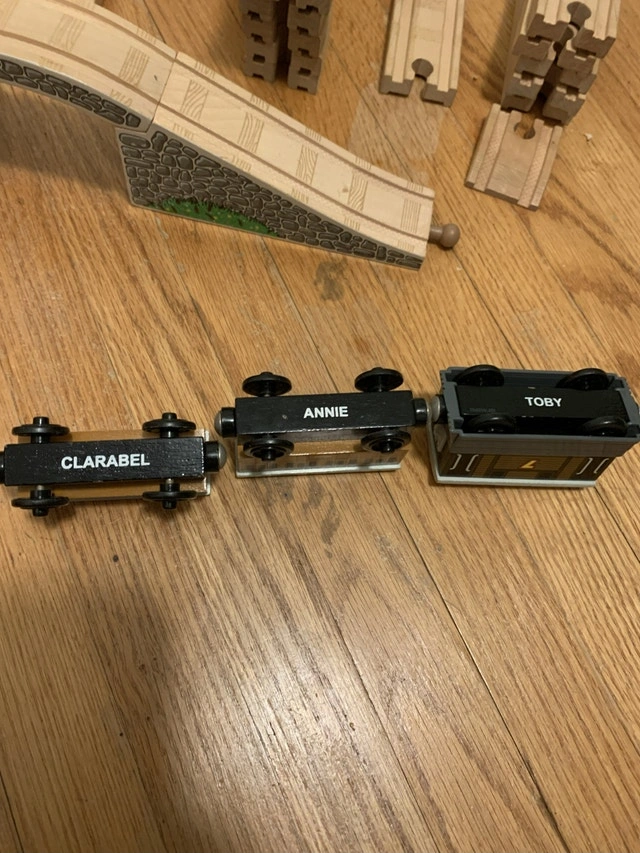Lot of Thomas the Tank Engine toys & Railway Rhymes Book! Includes 26 licensed Thomas brand track pieces, including 1 bridge & one crank lift bridge. Also includes 9 classic wooden train cars, including Thomas, Light n Sounds James, Percy, Annie, Clarabelle, Mavis, Ivo Hugh, a Station Master in shelter with gate, 37 Brio brand track pieces that are compatible with Thomas tracks and cars, 4 Brio engine/cars, a covered bridge and a Thomas the Tank Engine Railway Rhymes Book, all in excellent second-hand condition.