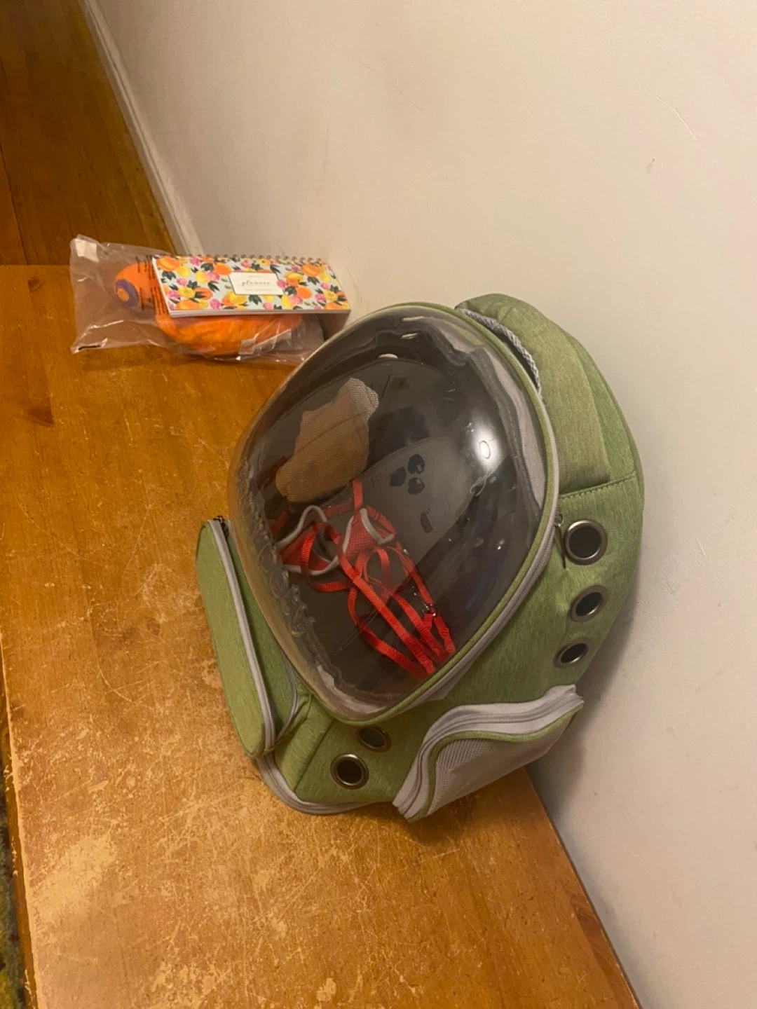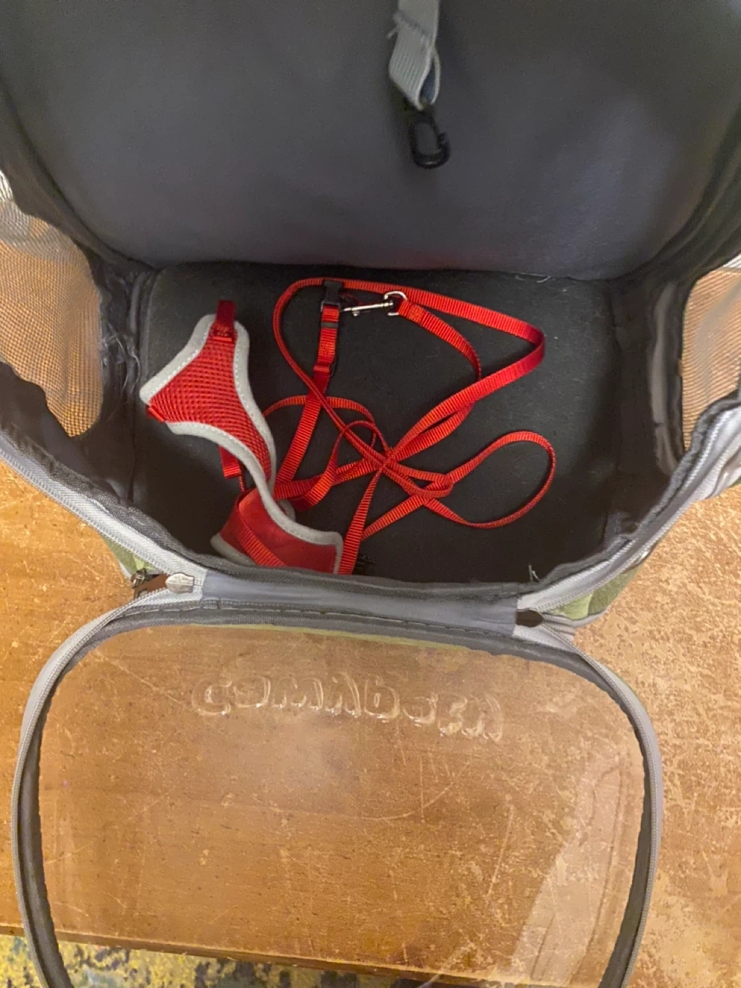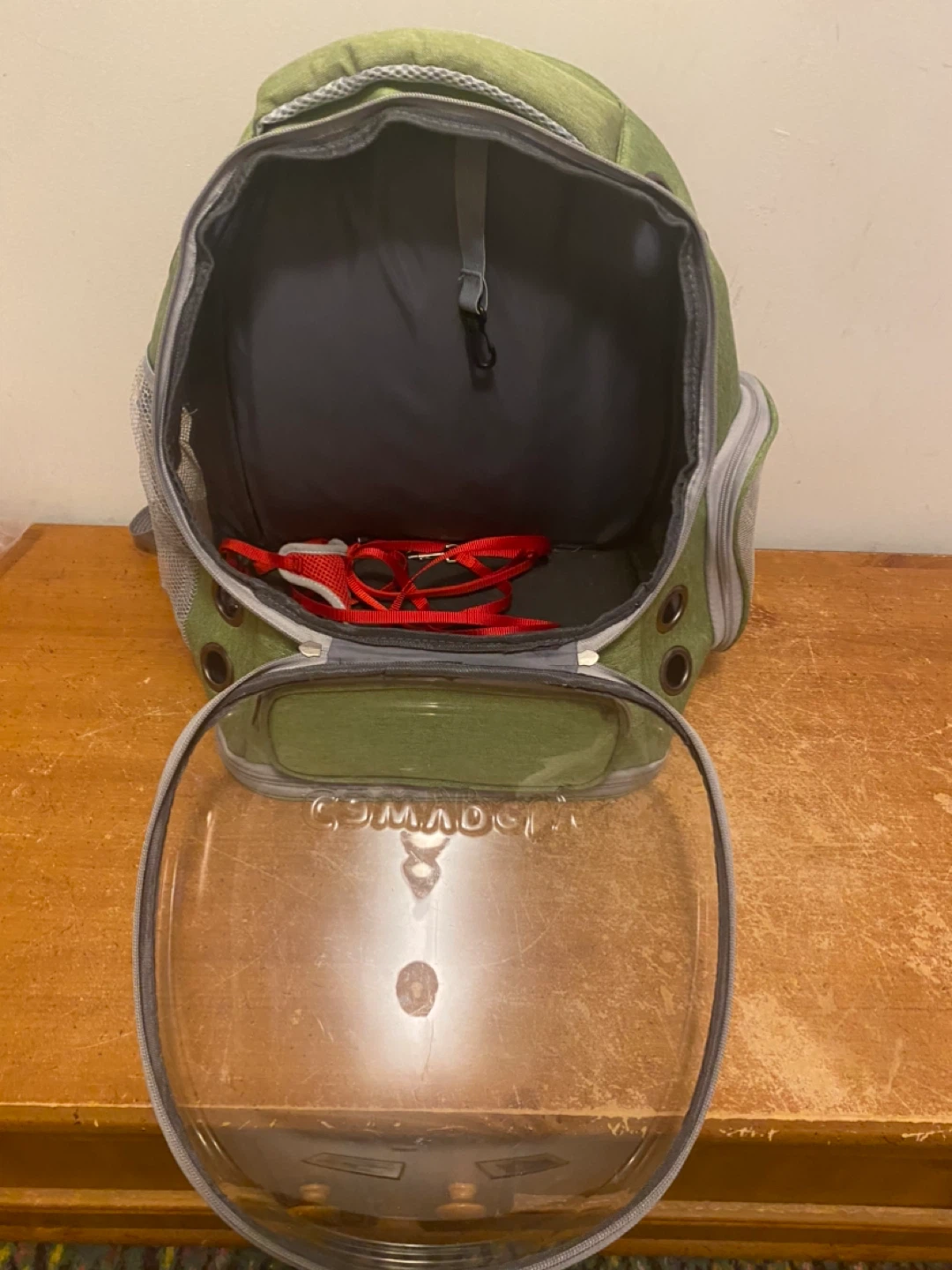 This is a Comadore pet carrier backpack in green! It has been gently used but is in great condition (my cat got a bit too chunky for it π). Several zippers allow you easy entrance and exit and the clear backing let your furry friend see everything going on. Perfect for your furry friend's next adventure.