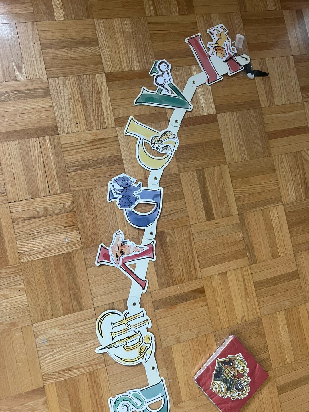 Selling a Harry Potter themed birthday banner and napkins. The banner spells out "Happy Birthday" with Harry Potter themed letter designs. Also included is a pack of Harry Potter napkins!