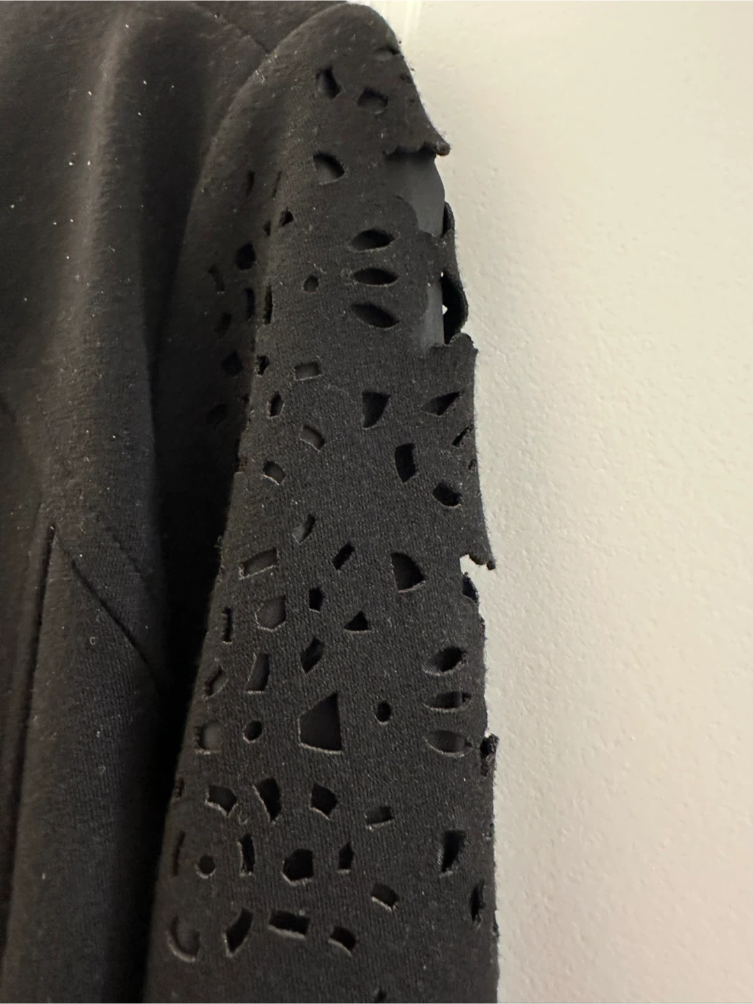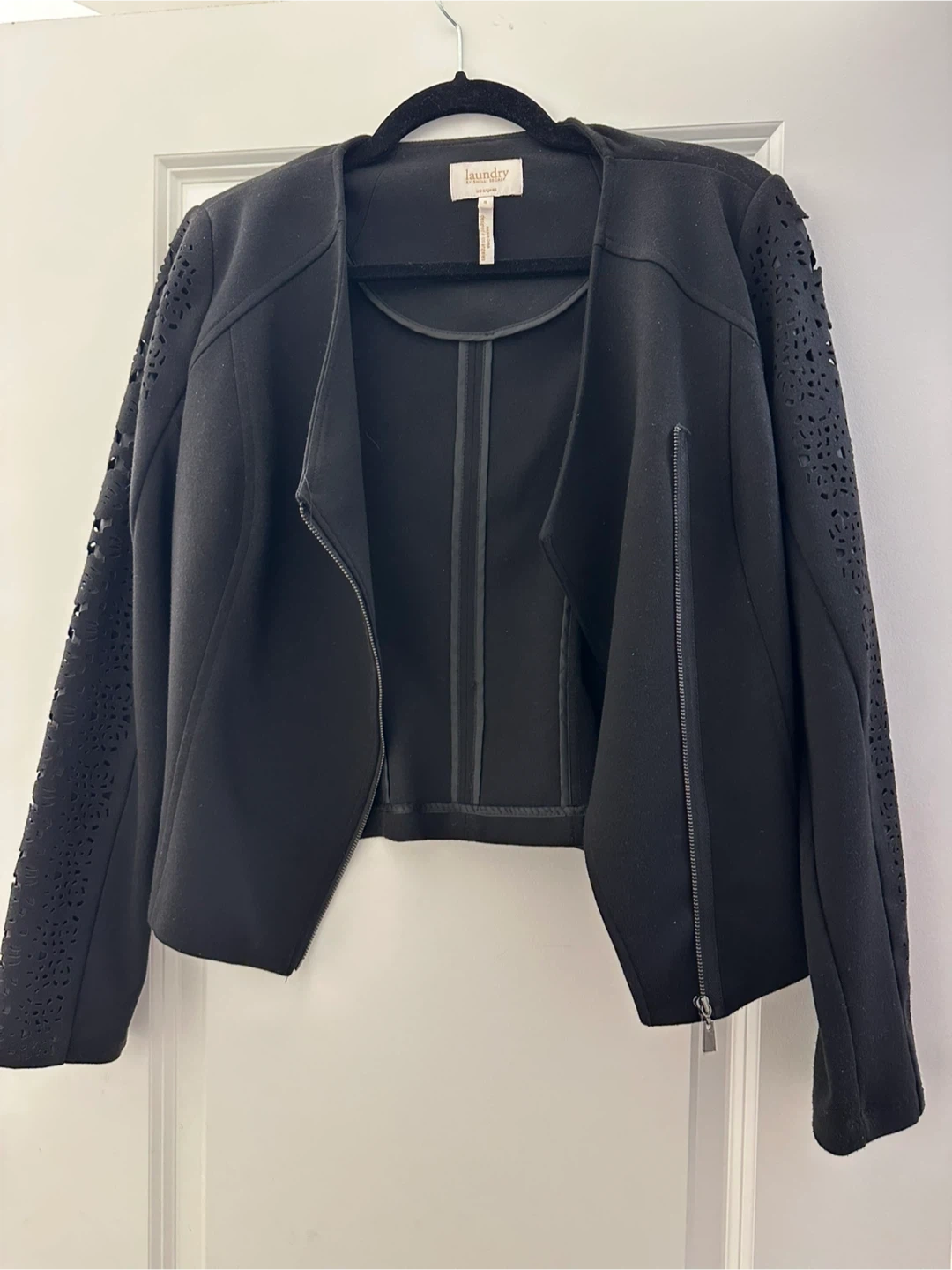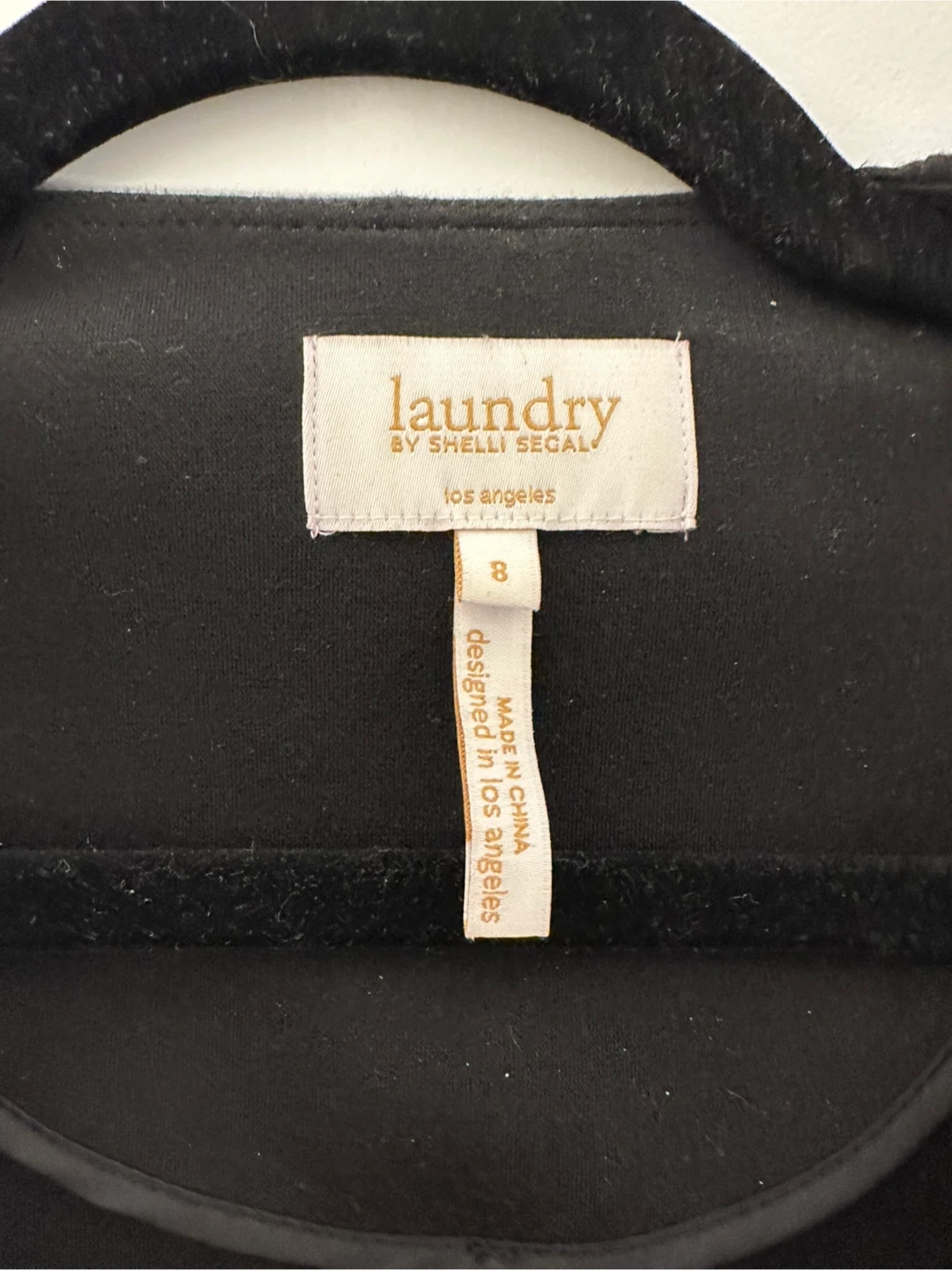 Selling a Laundry by Shelli Segal jacket in size 8. It's a stylish black jacket for ladies with a unique design on the sleeves. Perfect for adding a touch of elegance to your outfit!