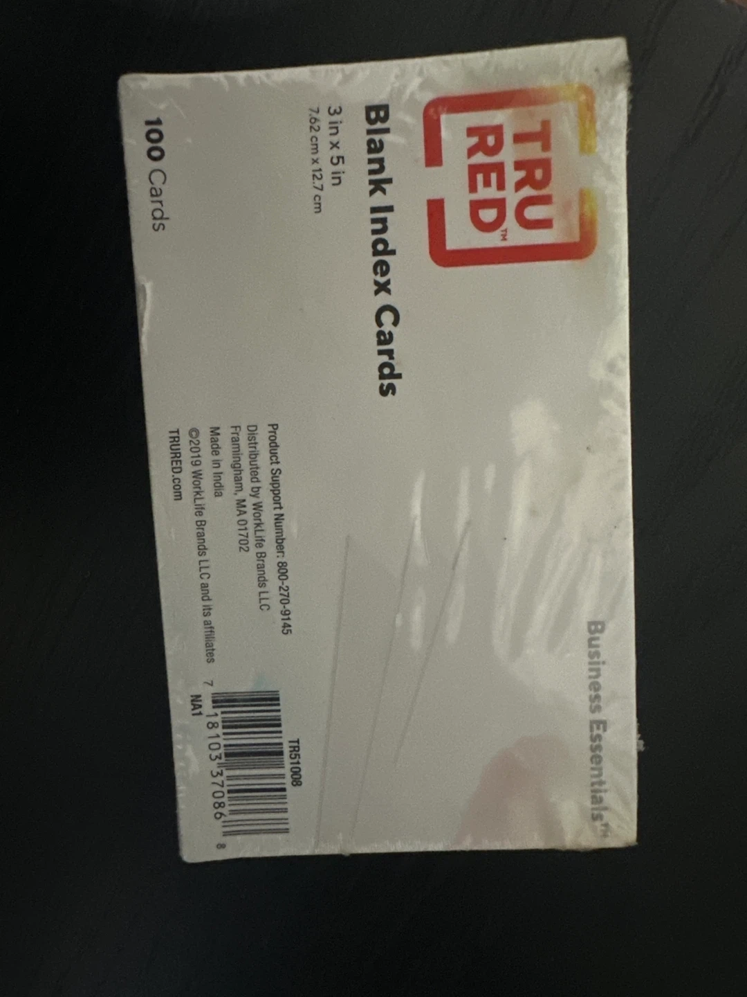 Selling a pack of TRU RED Blank Index Cards. These are 3 in x 5 in (7.62 cm x 12.7 cm) and come with 100 cards. Great for business essentials or studying