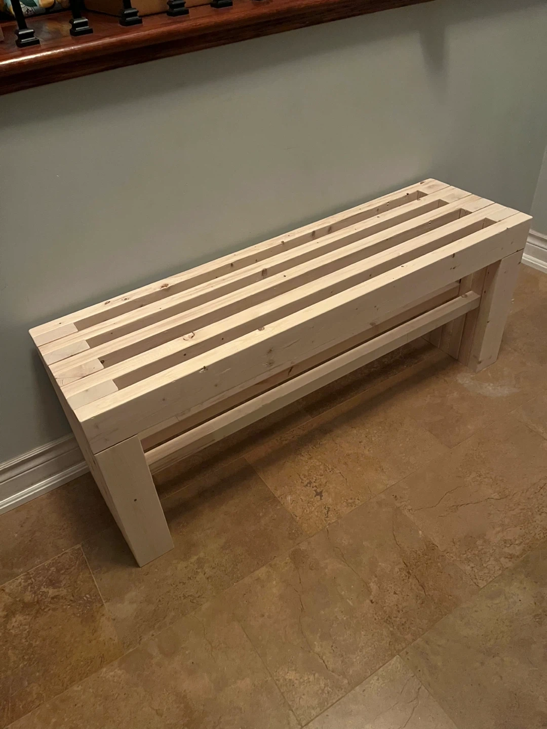 Selling a wooden slatted bench. It's in great shape and would be perfect for an entryway or mudroom. The bench has a simple, minimalist design that would complement any decor and its approximately 48inches long