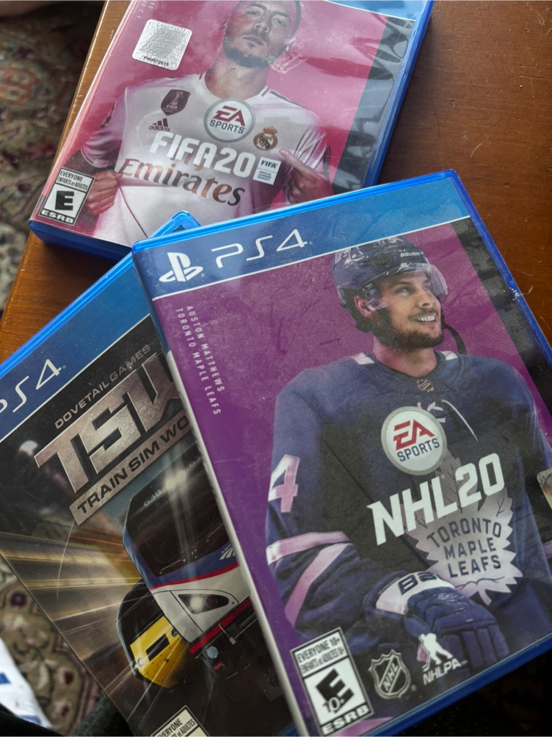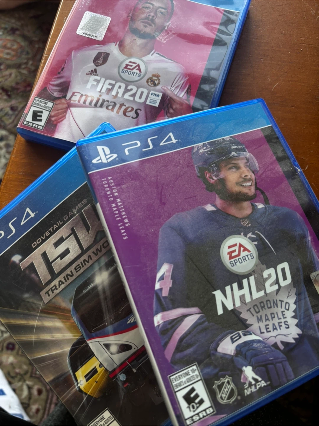 Selling a used PlayStation 4 (2020) w/ disc drive, 500 MB storage. It comes with a controller, power cable, HDMI cable, and controller charging cable. Good condition! FIFA 2020, NHL 2020 and Train SIM World discs throw in for fun.