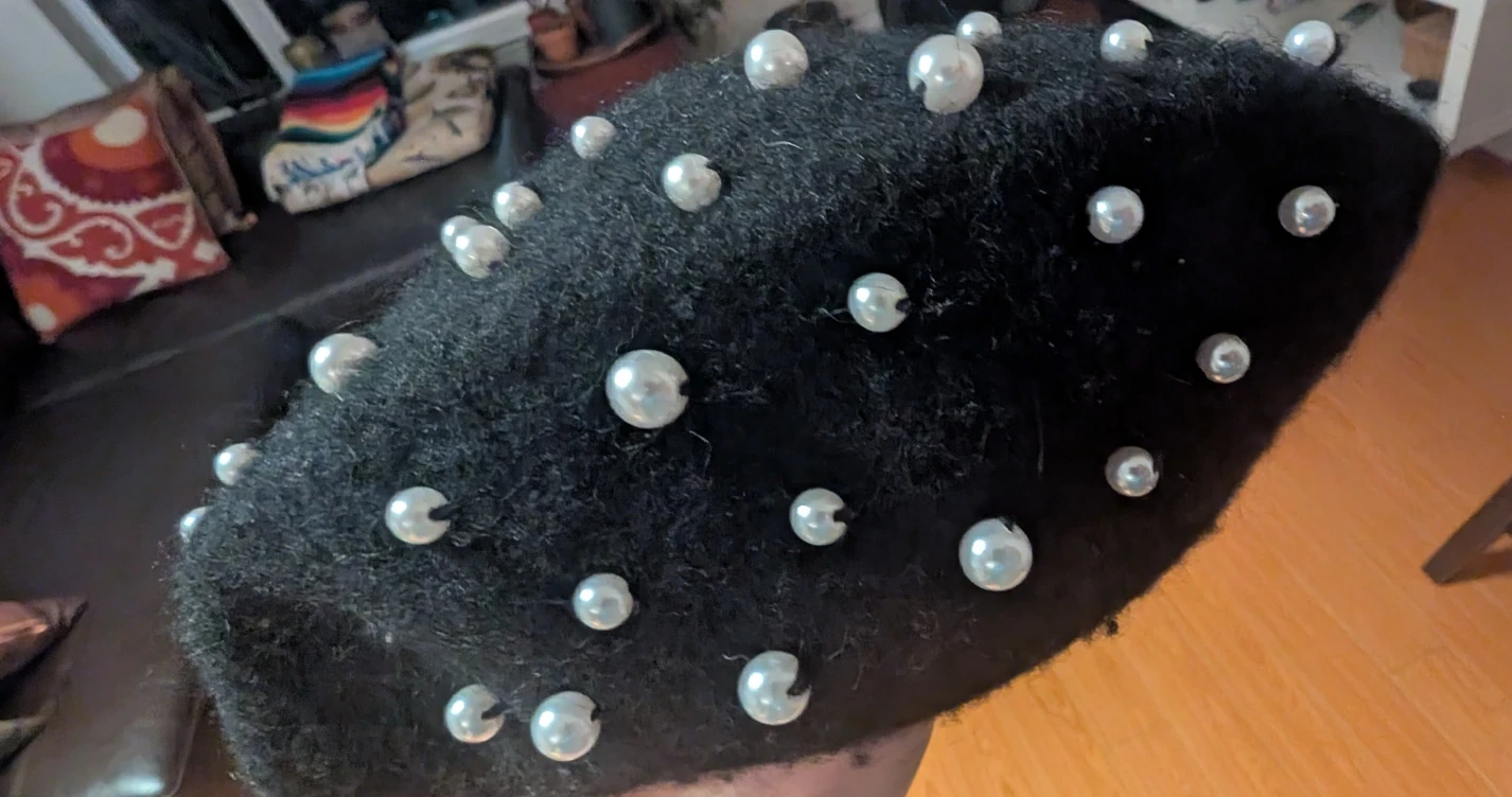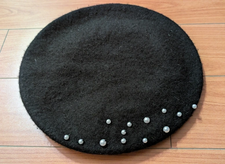 Selling a stylish black beret adorned with pearl accents! It's in great condition and adds a touch of elegance to any outfit. Perfect for completing your look!