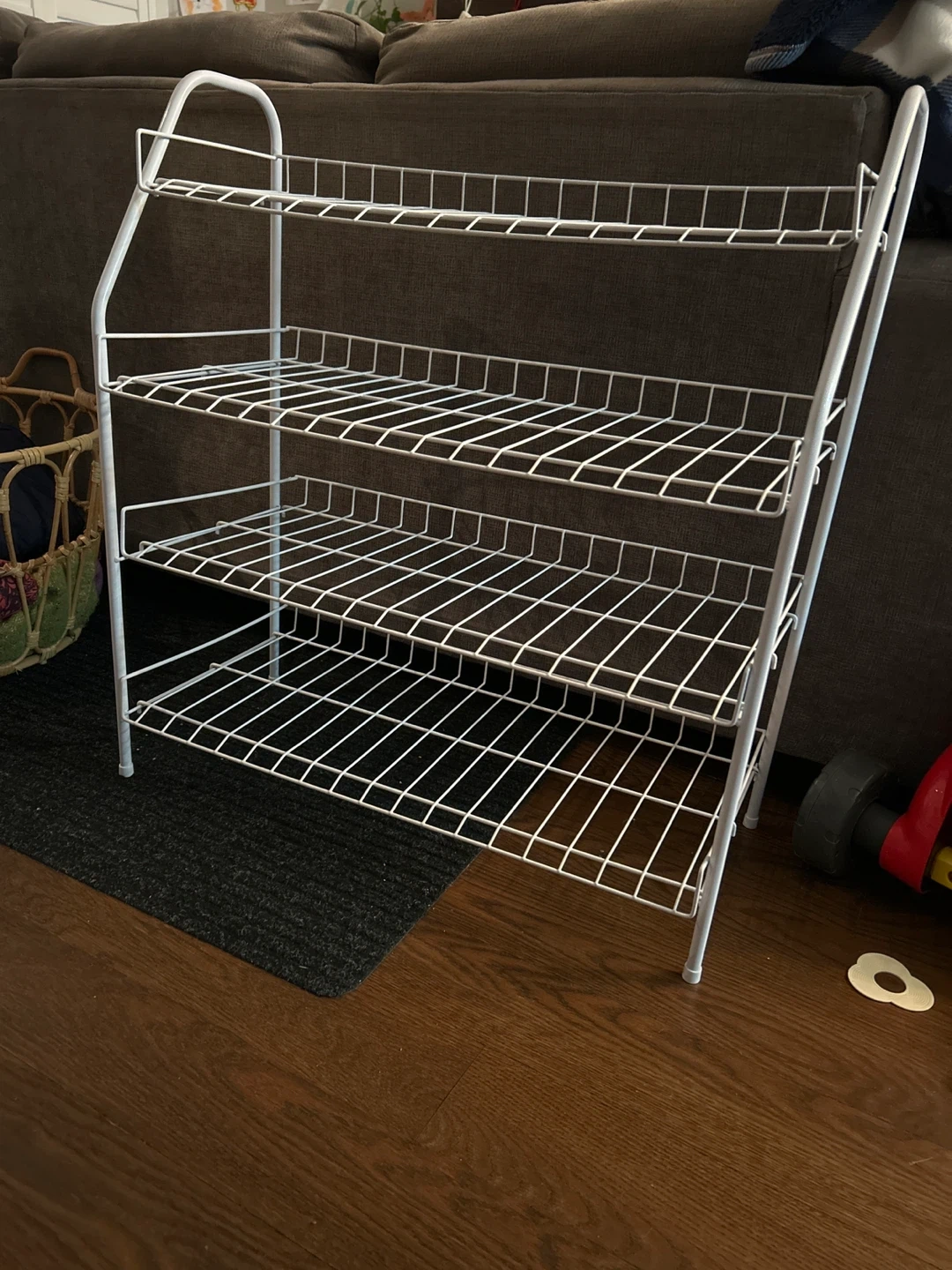 Selling a four-tier white metal wire shelf rack! It's in great shape and perfect for organizing shoes, plants, or anything else you need to store. It's lightweight and easy to move around, making it a versatile addition to any room.
