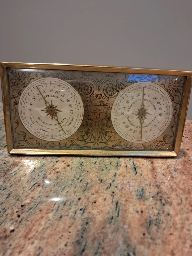 Here's a vintage Wittnauer barometer and thermometer in a gold-tone frame! It measures both relative humidity and temperature in Fahrenheit and Centigrade. A unique piece for your home decor!