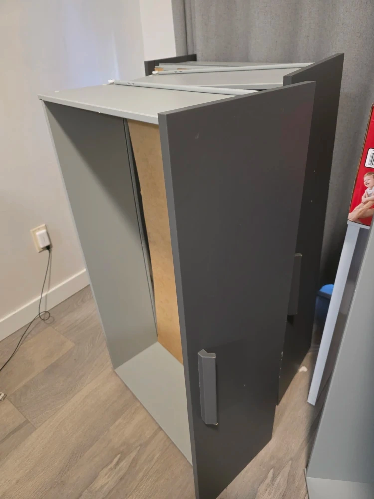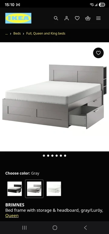 Selling an IKEA Brimnes bed frame with storage and headboard. It's a Queen size and comes in gray. Dimensions are 240 cm (94 1/2") long and 158 cm (62 1/4") wide. The headboard is 111 cm (43 3/4") tall. Perfect for adding extra storage to your bedroom!