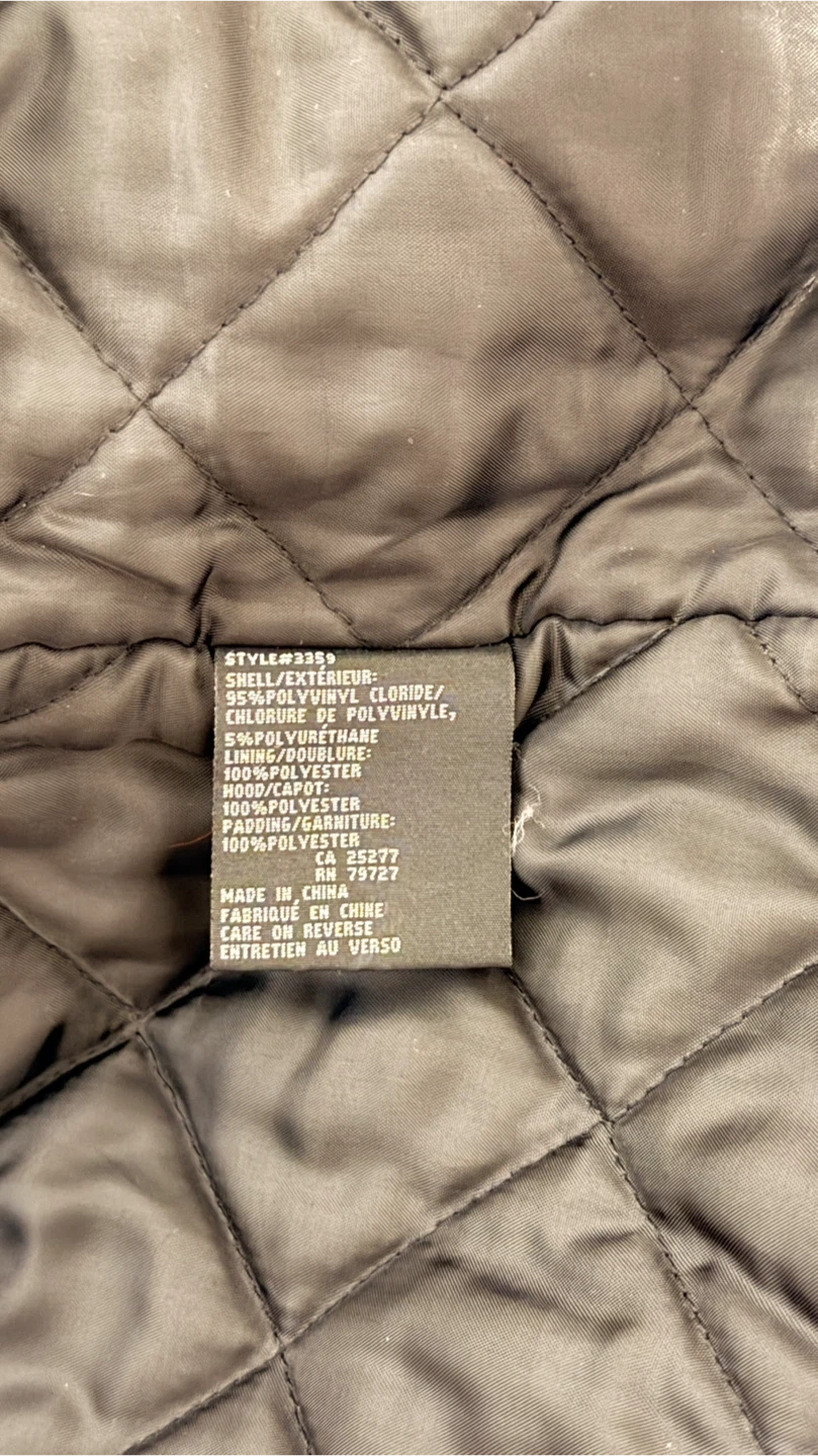 Stylish black faux-leather jacket with removable hoodie insert. Warm quilted interior, multiple zip pockets, and modern design. Great for fall/winter.