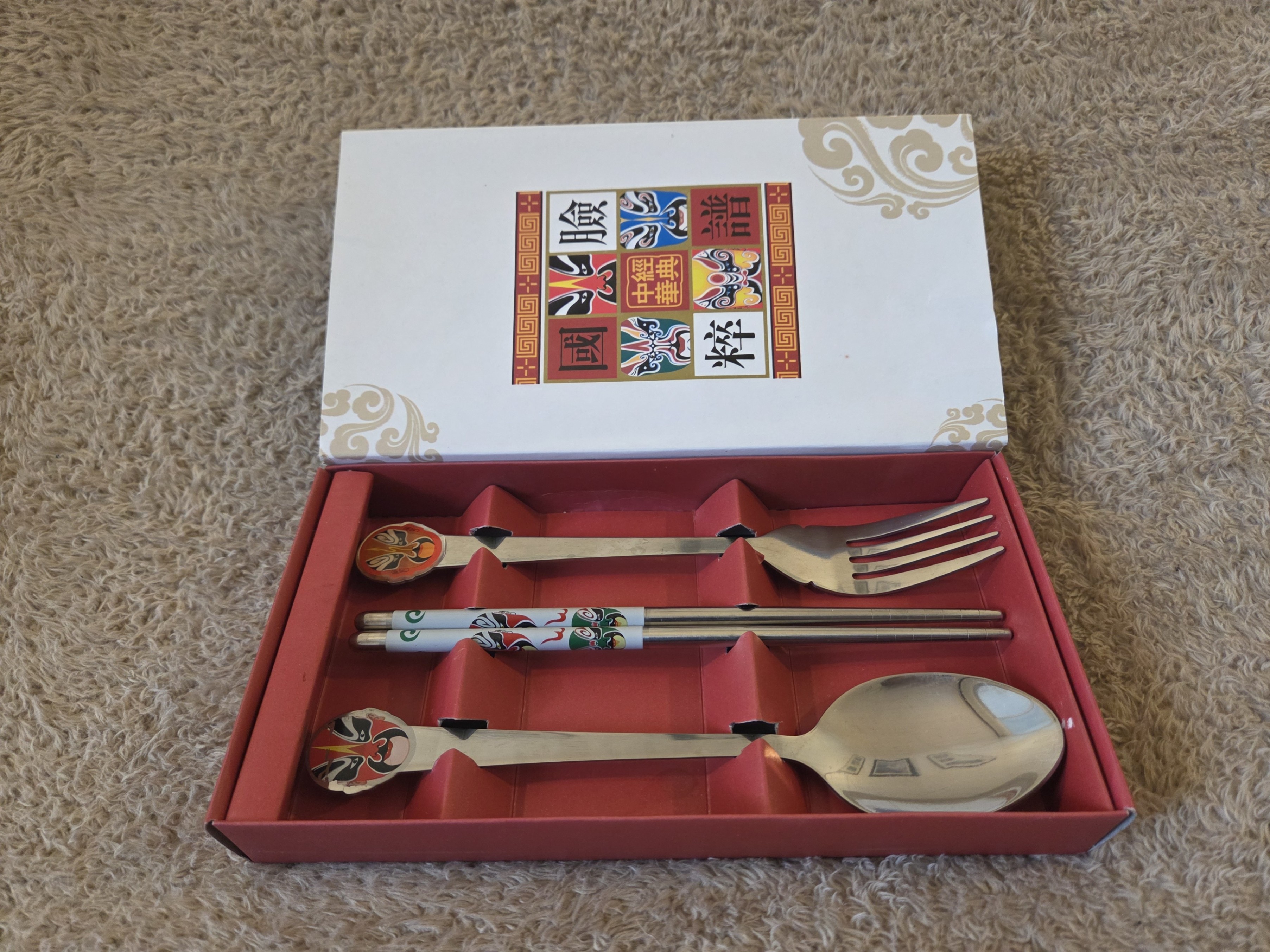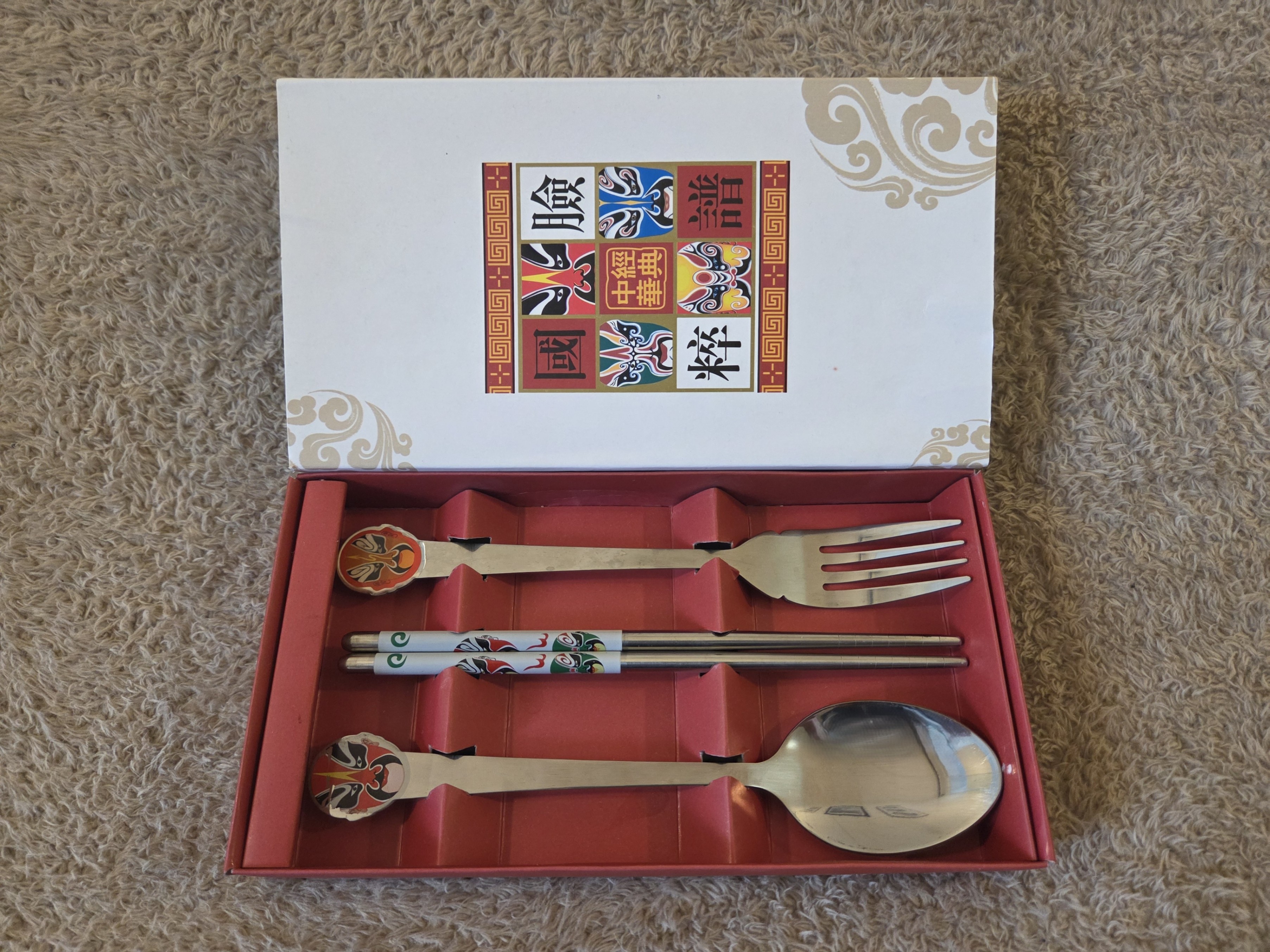 Decorative 4-piece stainless steel cutlery set inspired by Beijing (Peking) Opera masks. Includes spoon, fork and a pair of chopsticks in a gift box. Color enamel mask medallions on the spoon and fork plus printed masks on the chopsticks – a fun, giftable set for noodles, rice bowls, hot pot or display.