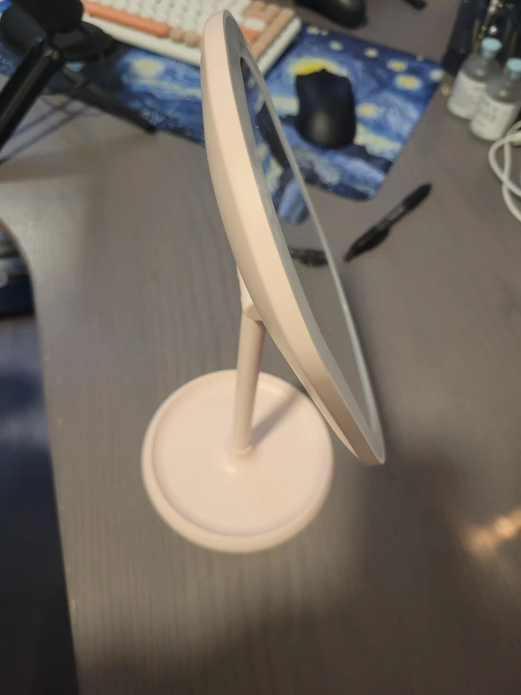 Selling a cute pink LED lighted makeup mirror! It's in great condition and perfect for getting ready. It has a stand and a touch sensor to turn on the LED light around the mirror. It would look great on any vanity or desk!