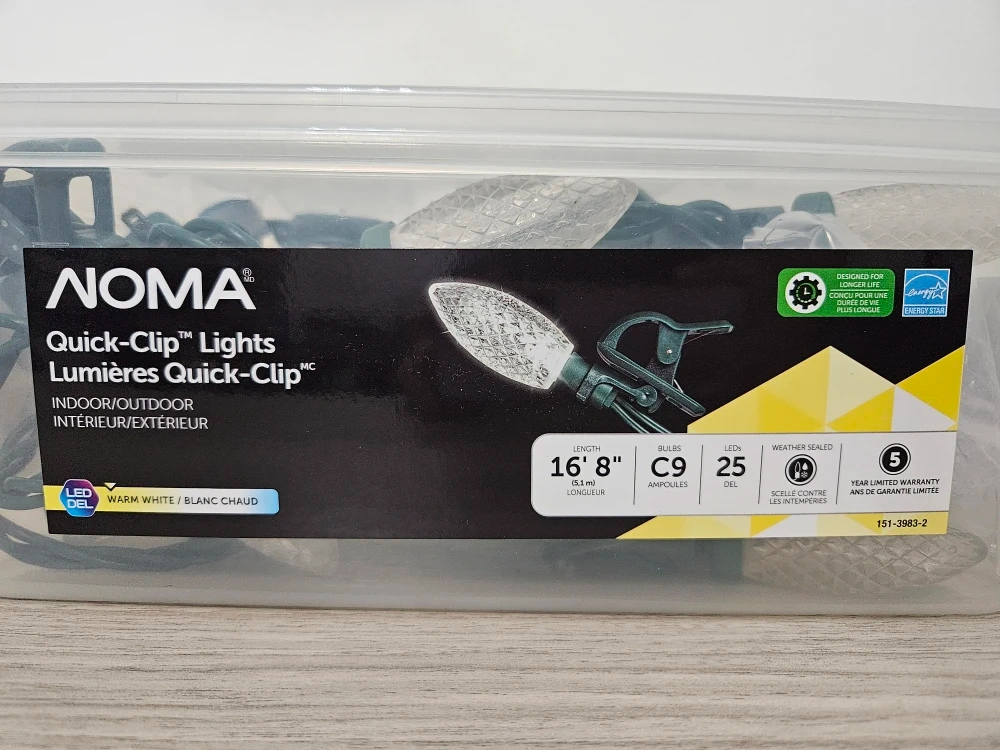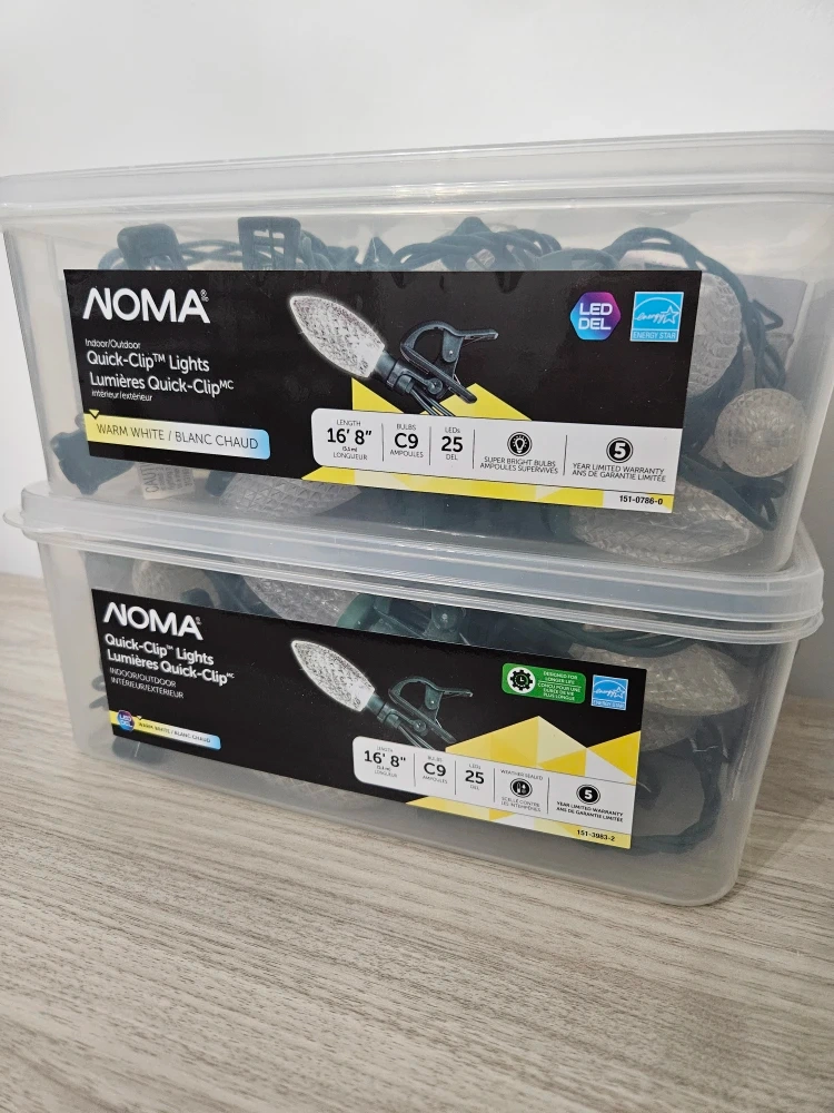 Brand: NOMA - Indoor/Outdoor Quick Clip Color: Warm White Length: 16' 8" Bulb: C9, 25 LED Bulbs Features: 2.4W, uses 90% less energy, weather sealed Includes: 4 spare light bulbs Tested, cleaned and stored. Bought 2 boxes and used for a season and no longer needed. $25 for one or $40 for both Will not respond to auto messages. Only message for questions and/or pick up location