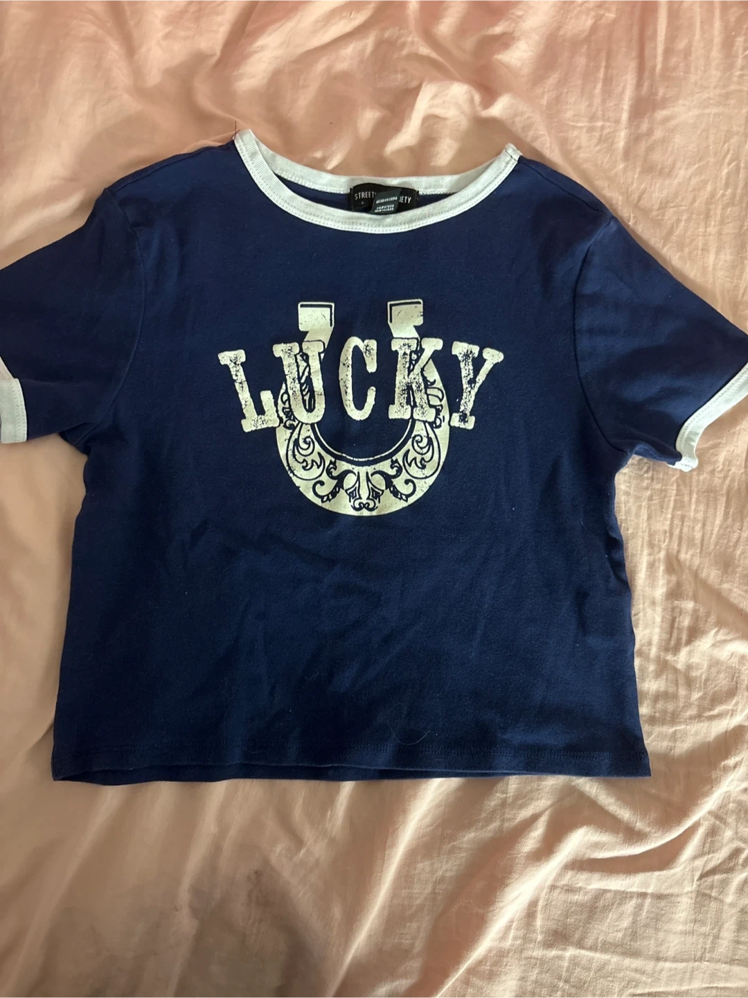 Cute navy blue tee from Street Society! It features a white ringer neckline and sleeve trim, and a fun 'Lucky' graphic on the front. Perfect for a casual look
