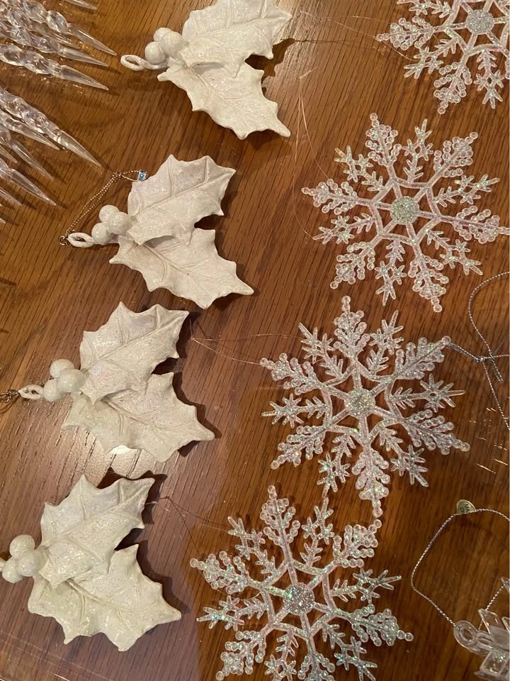 -24 various white/clear/silver/sparkly glass, acrylic, plastic, and metal ball-type ornaments in bottom of tote.