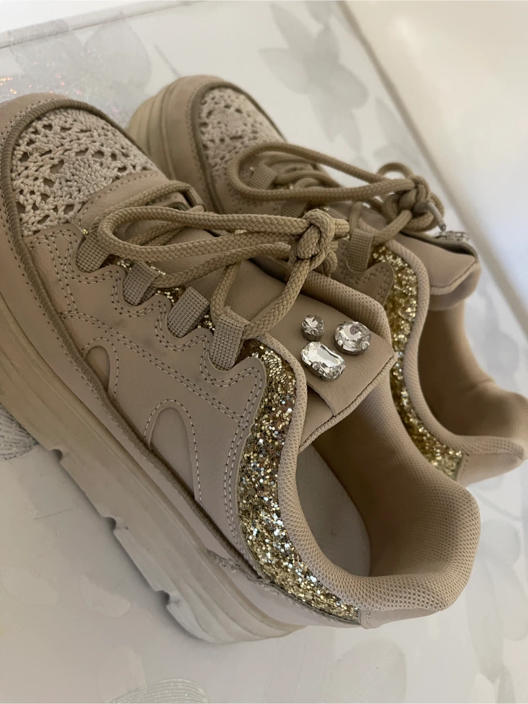 Cute beige sneakers with a unique glitter detail on the back! They're in great shape and ready for a new adventure one more us