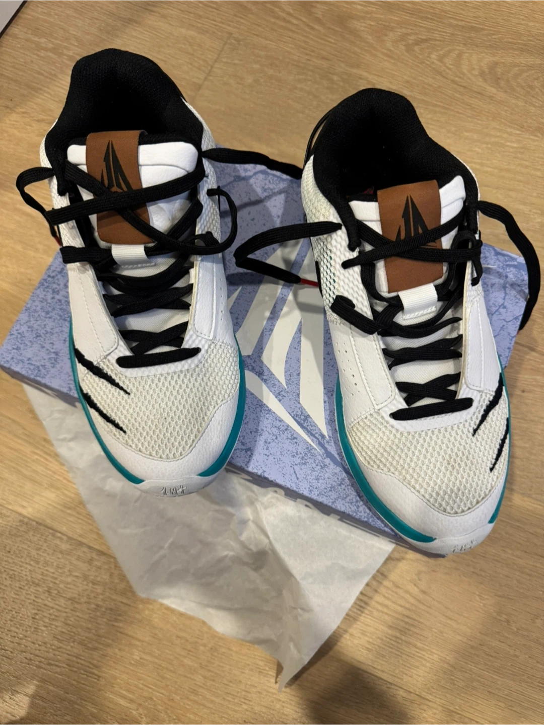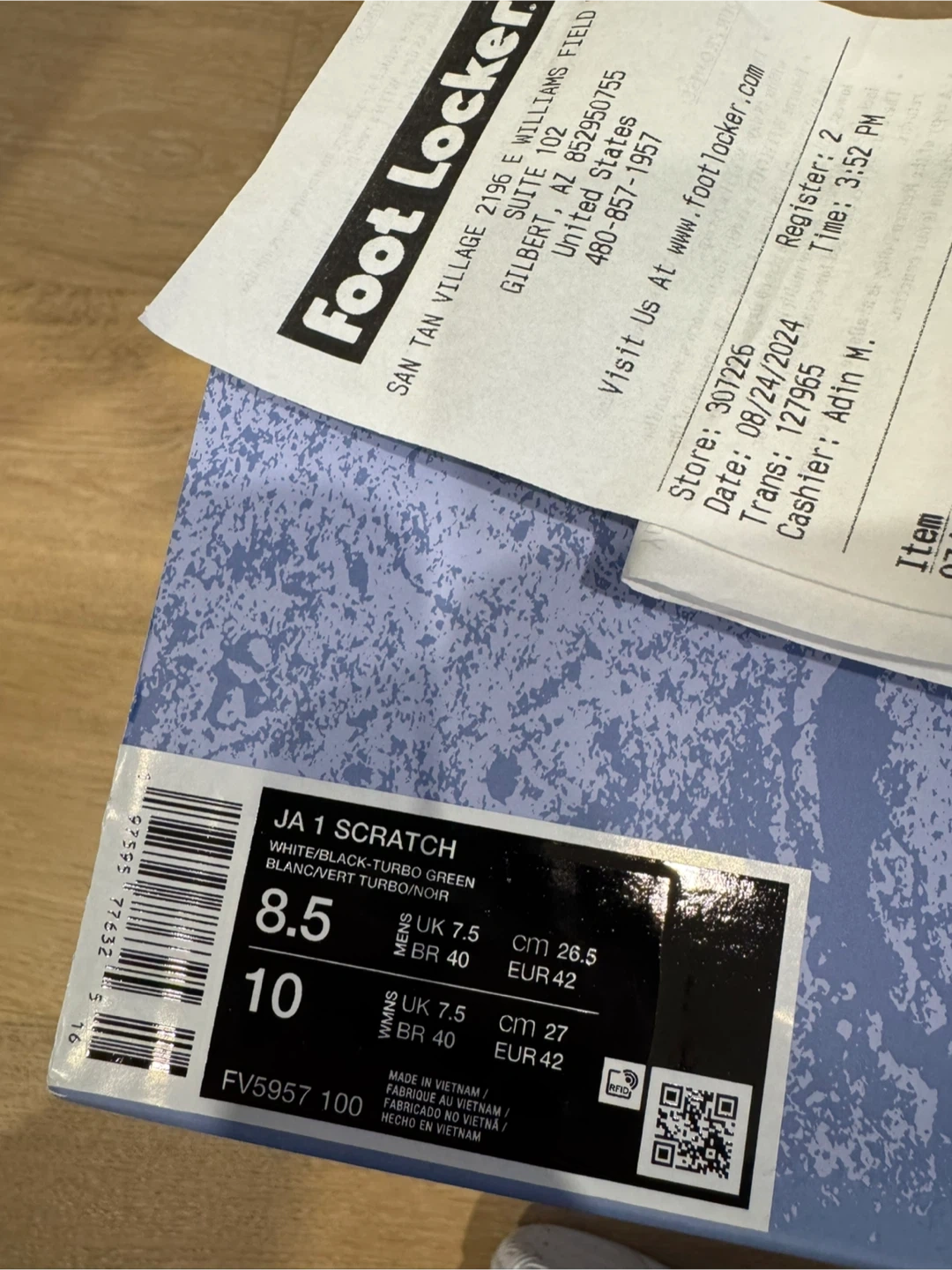 Selling a pair of Nike JA 1 Scratch sneakers in white, black, and turbo green. They are a men's size 8.5. Comes with the original box, tissue paper, receipt etc. I’ve worn these once. Great shoe for basketball.