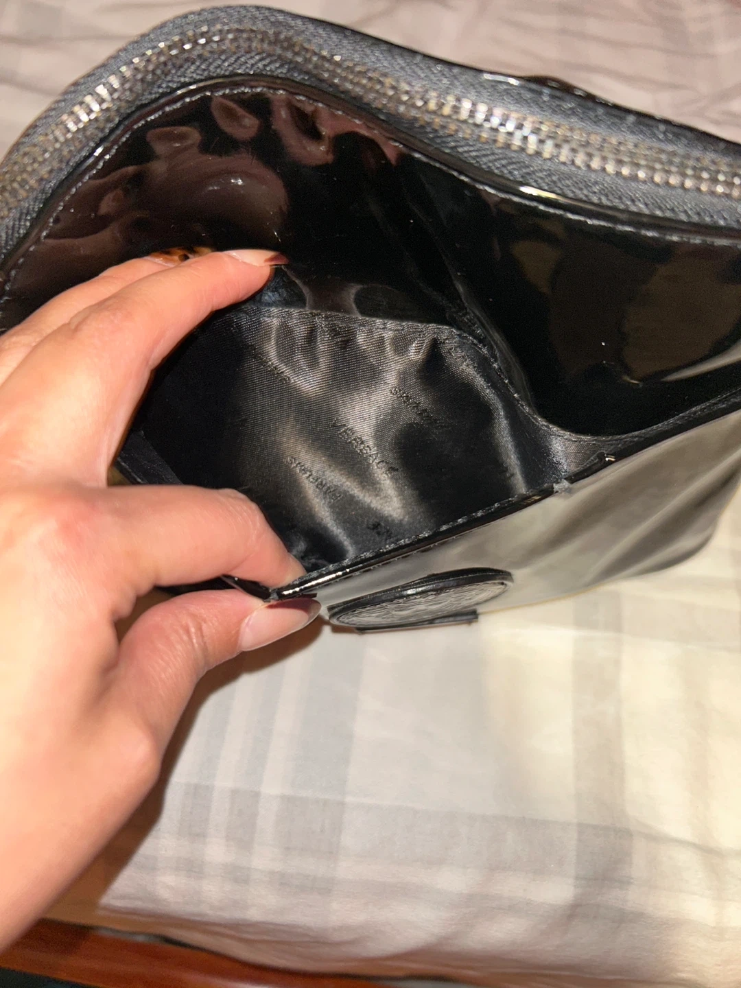 Selling a Versace cosmetic bag in black. It's in great condition and perfect for storing your makeup and skincare essentials. The bag features the Versace logo and has a zipper closure.