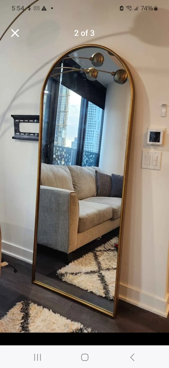 Selling a lovely gold arch standing mirror! It's in great condition and would look perfect in any room. The mirror has a sleek, modern design that complements a variety of decor styles. It's a great way to add some light and space to your home