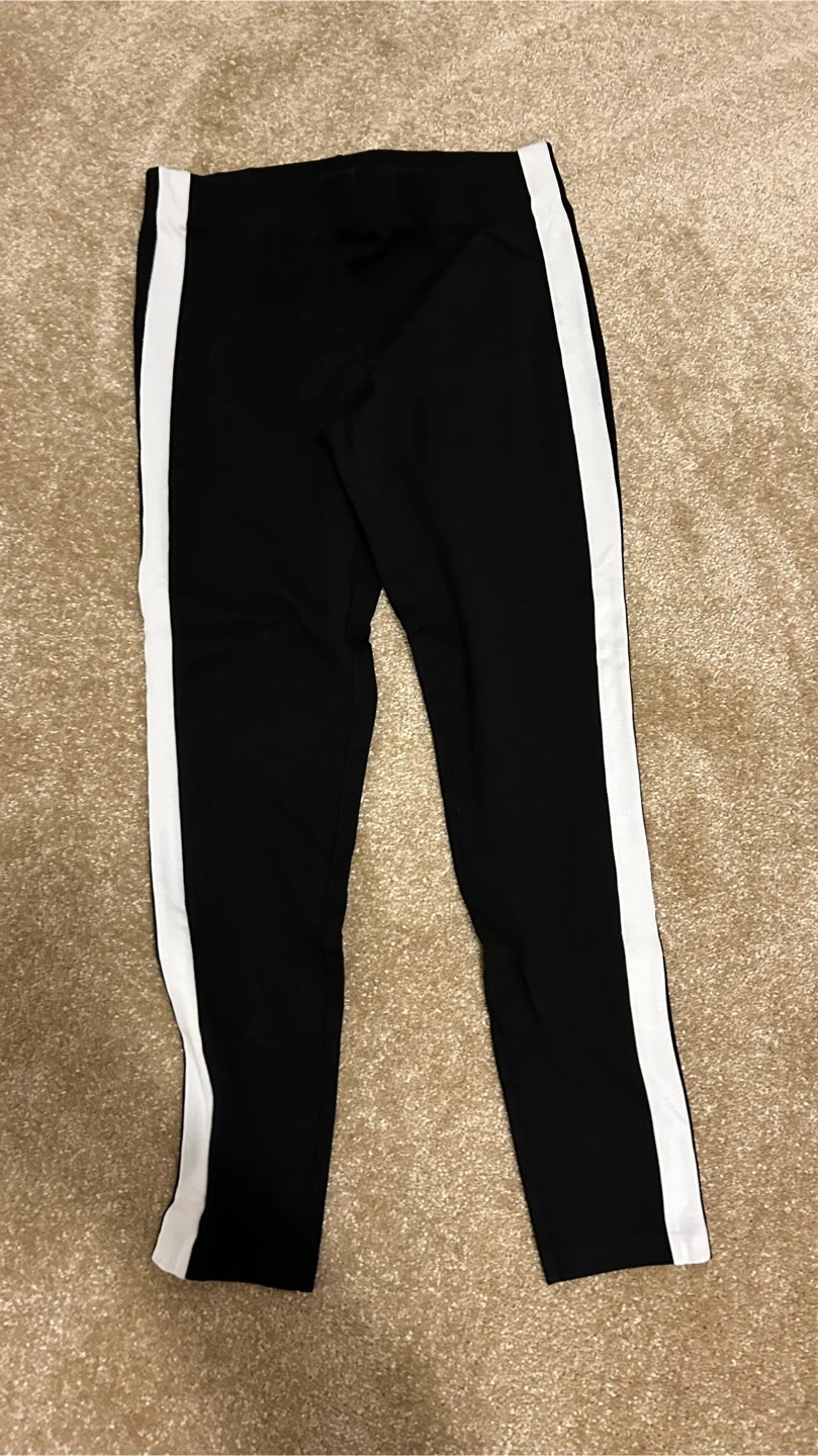 Selling a pair of black leggings with a white stripe down the side. They're in great condition and ready for a new owner!