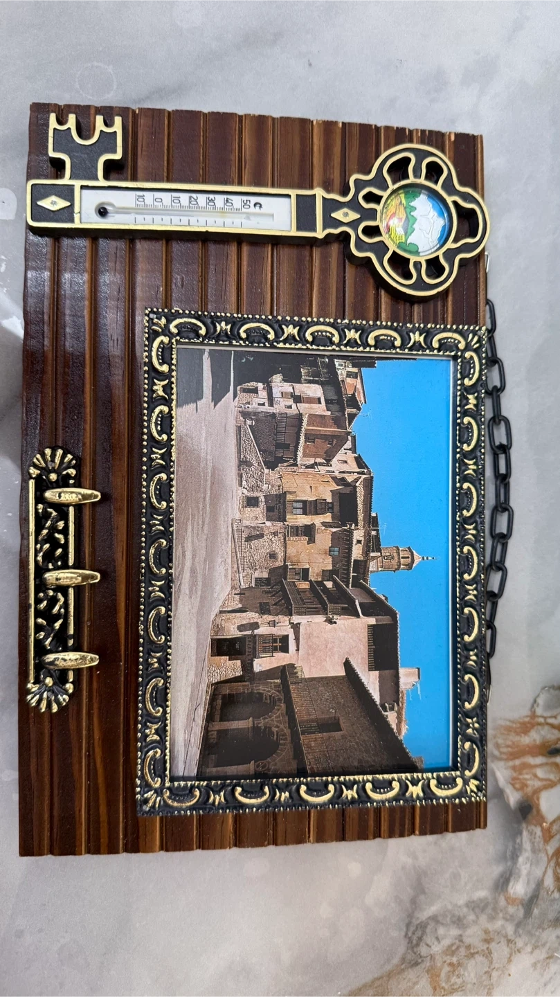 This is a unique decorative piece that combines a thermometer with a picture frame. It features a wooden backing, a key-shaped thermometer at the top, and a frame for a picture. The frame has a black and gold ornate design, and there's a chain detail on the side. It's a charming addition to any room!